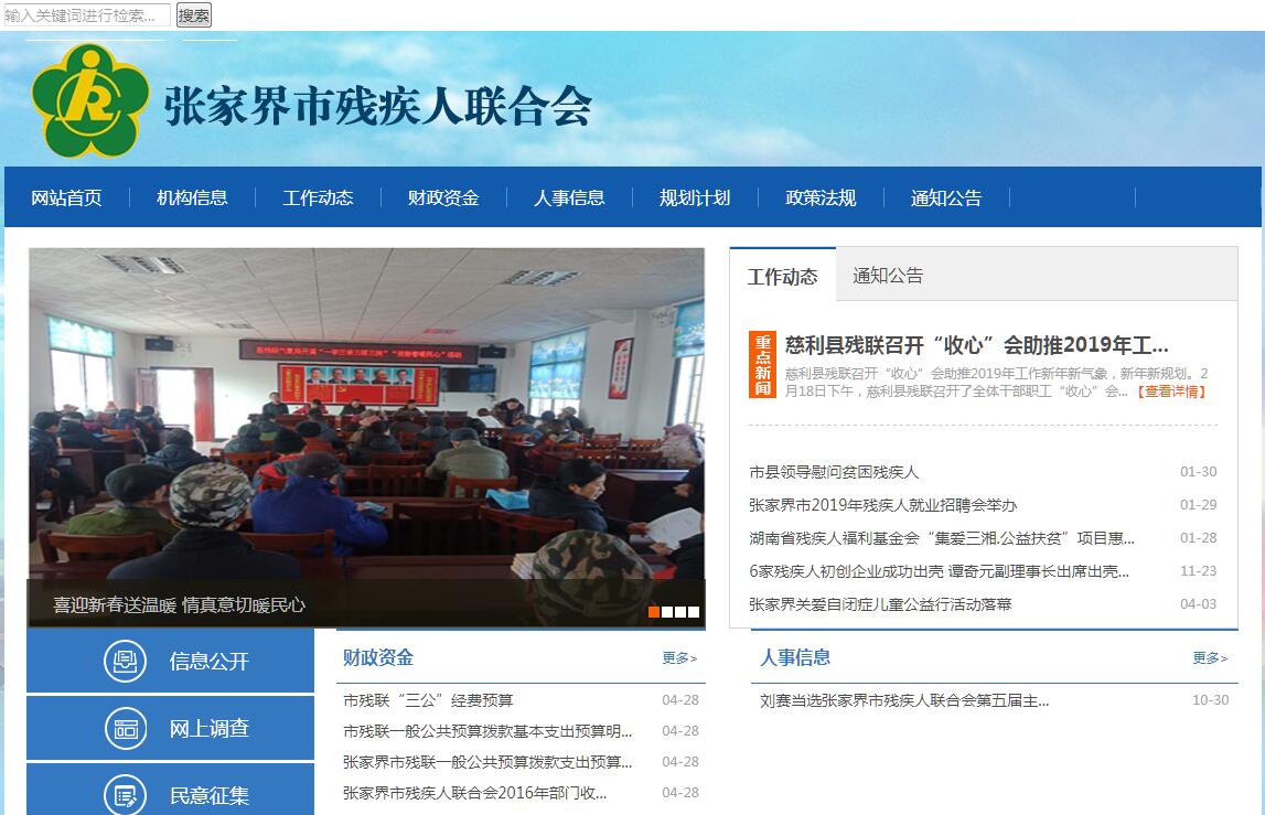 张家界市的残疾人事业是随着1991年5月《残疾人保障法》颁布实施而正式起步的。1991年6月召开的市残联第一次代表大会标志着市残联的正式成立。15年来,我市残疾人事业取得了全面的发展:组织体系和工作体系基本确立。市残联于1997年升格为直属市政府管理的正处级群团组织,参照公务员管理。现任书记王江华、理长刘三荷、副理事长卓志高。内设办公室、康复部和维权部,下辖市残疾人劳动就业管理中心、市残疾人职业技术中心、市残疾人康复服务指导站、市残疾人用品用具供应站和市聋儿语训部等五个二级事业单位。并管辖5个残疾人专门协会:市盲人协会、市肢残协会、市智力残疾亲友协会、市精神病残疾亲友协会。我市各级残联按照“代表残疾人利益、管理残疾人工作、服务残疾人群体”的宗旨全面开展各项残疾人维权工作。以《残疾人保障法》为武器,制定了《张家界市残疾人保障法规定》、《张家界市按比例安排残疾人就业规定》等地方性优惠政策,实施了张家界市残疾人事业“八五”、“九五”和“十五”的三个五年计划。残疾人康复工作成交显著:“十五”以来共组织实施白内障复明手术2530例,儿麻及其他肢体残疾矫治手术118例,供应残疾人用品用具2110件。残疾人劳动就业状况正在得到进一步改善,积极扶持兴办福利企业,集中安置残疾人就业281人,扶持残疾人个体从业743名。依法推行残疾人按就业政策,累计征缴残疾人就业保障金430万元,新增残疾人按比例就业12人。扶贫解困力度逐年加大,“九五”期间共争取国家康复扶贫贷款905万元,采取“公司+农户”方式扶贫,已基本解决了1.33万名贫困残疾人温饱问题。从2004年起,实施残疾人“安居工程”,共为280户残疾人无房户和危房户建起了新房。残疾人宣传文体活动蓬勃发展,两次组团参加全省运动会,获“七银三铜”,2000年选派残疾人能工巧匠参加全国玩意儿人职业技能大赛,获得一项全国第三名,2005年成功组团参加全省第6届残疾人文艺汇演,获得两个铜奖。积极开展残疾人法律援助工作,代理涉残诉讼96起,为残疾人减免代理费用8万余元,挽回经济损失63万余元,切实维护了残疾人的合法权益。