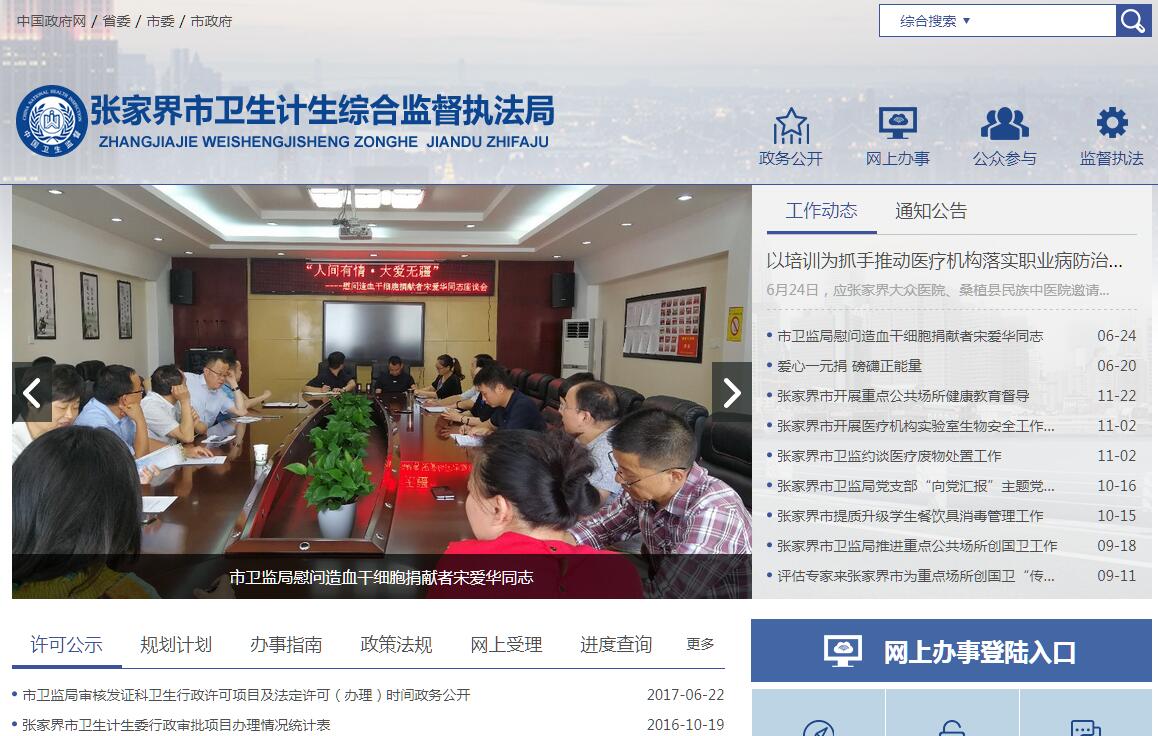 张家界市卫生计生综合监督执法局是参照公务员法管理的卫生行政执法单位,具体承担卫生行政部门的卫生监督执法工作职责。它包括公共场所(7大类32种)卫生、学校卫生、饮用水卫生、职业卫生、放射卫生五大卫生监督执法;包括了医疗卫生机构执业、母婴保健机构执业、采供血和机构执业的卫生监督执法;包括了传染病防治、地方病防治和职业病防治的卫生监督。除此,还要完成市委、市人民政府和上级业务主管部门交办的其他工作等。现内设办公室、稽查科、职业病监督科、传染病防治监督科、执业监督科、综合监督科、市场监督科、场所监督科、产品监督科9个科室,下设直属武陵源卫生监督所及永定卫生监督所二级机构2个。单位2015年编制23人,实际在职20人。其主要职责是:1、负责卫生和计划生育综合监督规划、工作计划的制定和组织实施,并对下级卫生和计划生育综合监督工作进行监督、稽查与指导。组织开展卫生和计划生育综合监督执法检查,负责受理涉及健康相关产品、卫生和计划生育等的投诉举报,并依法开展调查处理。2、负责公共场所的卫生行政许可、日常监管和依法处罚违法违规行为。负责从业人员健康体检的日常监管,依法处罚违法违规行为。3、收集、统计、分析、上报各种卫生和计划生育综合监督工作资料和工作信息。4、负责职业病危害企业的职业病防治宣传教育和培训,组织实施卫生和计划生育法律法规咨询、宣传和教育。负责相关单位管理人员、从业人员的卫生和计划生育法律法规知识培训。