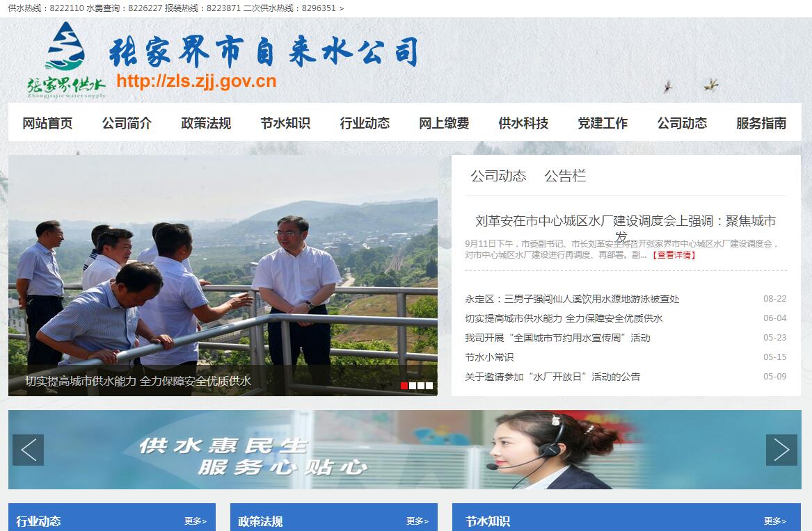 张家界市自来水公司隶属市住建局,成立于1982年,是一家以自来水生产供应、市政工程安装、二次供水服务为主的国有独资供水企业,服务人口近20万人,服务面积24平方公里,供水人口约26万人,总户数95729户,其中实现远程智能抄表达46792户,供水基本覆盖整个中心城区,供水普及率达96%,水质综合合格率99.8%。;现下辖4个水厂,总供水能力17万吨/日,拥有DN100以上供水管网总长242.01千米,在线压力监测点25个,二次供水加压站78个,加压设备111套,具备106项卫生指标检测能力。下辖两个全资子公司:张家界祥宇市政工程有限责任公司和张家界科标水质检测有限公司。目前公司总资产1.2亿元,净资产7395万元,在职员工306人。作为国有公益企业,公司始终秉承“安全、高效、优质、文明”供水的理念,大力弘扬“精诚团结、求真务实、勇于创新”的企业精神,为市中心城区居民提供安全水、放心水、优质水,为张家界市社会经济发展做出积极贡献。近几年公司多次获得“湖南省文明行业”、“湖南省集中式供水卫生管理先进单位”、“湖南省城市供水先进单位”、“市行业纳税状元”和“市国资委先进基层党组织”等荣誉称号,涌现出了“全国五一劳动奖”省级劳模秦周武、市级劳模陈继文、“全国优秀工会积极分子”黄兰等先进模范人物。