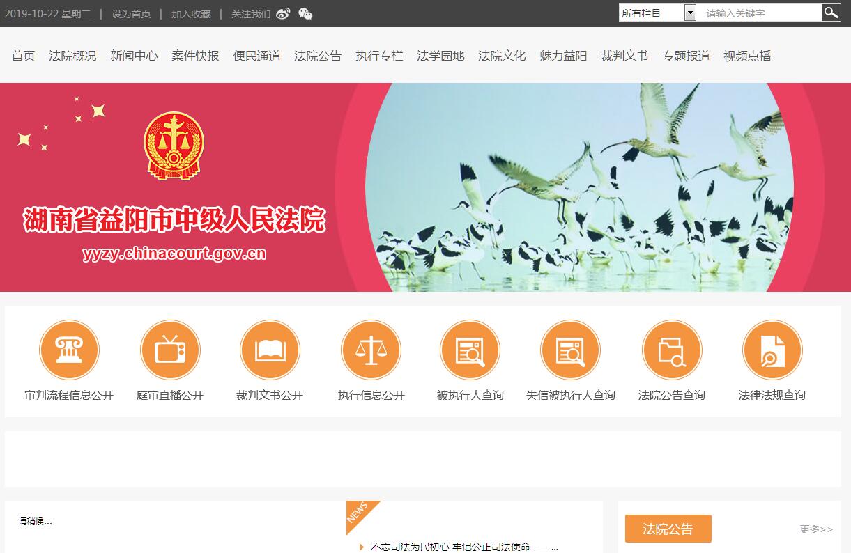 益阳法院起始于建国后的1950年6月设立的湖南省人民法院益阳专区分院。1952年10月益阳专区与常德专区合并时,并入湖南省人民法院常德专区分院。1962年12月,设立湖南省益阳地区中级人民法院。1994年6月,益阳撤区建市,更名为益阳市中级人民法院。随着社会经济的不断发展和行政区划的调整,益阳市的审判机构不断健全。现益阳市中级人民法院下辖安化县、桃江县、资阳区、赫山区、沅江市、南县、大通湖区等七个基层人民法院,县(市)区法院派驻农村的人民法庭32个。全市两级法院共有干警757人,其中法官303人。全市法院年结案数在4万件左右。益阳中院设9个审判业务部门和7个综合管理部门,在岗人员145人,其中员额法官60人。近年来,益阳两级法院立足大局,着力服务经济发展;打击犯罪,切实维护社会稳定;定纷止争,努力化解社会矛盾;重拳出击,全力破解执行难题。维护了社会稳定,服务了经济发展,把责任与使命扛在肩上,各项工作取得了显著的成绩。益阳中院领导班子在总结过去工作的基础上,描绘了新的美好蓝图,明确了今后一段时期益阳法院工作总的目标。即:坚持以习近平新时代中国特色社会主义思想为指导,认真学习贯彻落实党的十九大精神,紧紧围绕“四个全面”战略布局和新发展理念,坚持司法为民、公正司法,切实加强审判执行工作,全面深化司法体制综合配套改革,努力提升队伍“八项本领”,为建设富饶创新开放绿色幸福新益阳提供强有力司法保障。益阳中院正在以一往无前的勇气,敢为人先的魄力,真抓实干的作风,抢抓机遇,谱写新的篇章,开创益阳法院更加辉煌灿烂的明天。