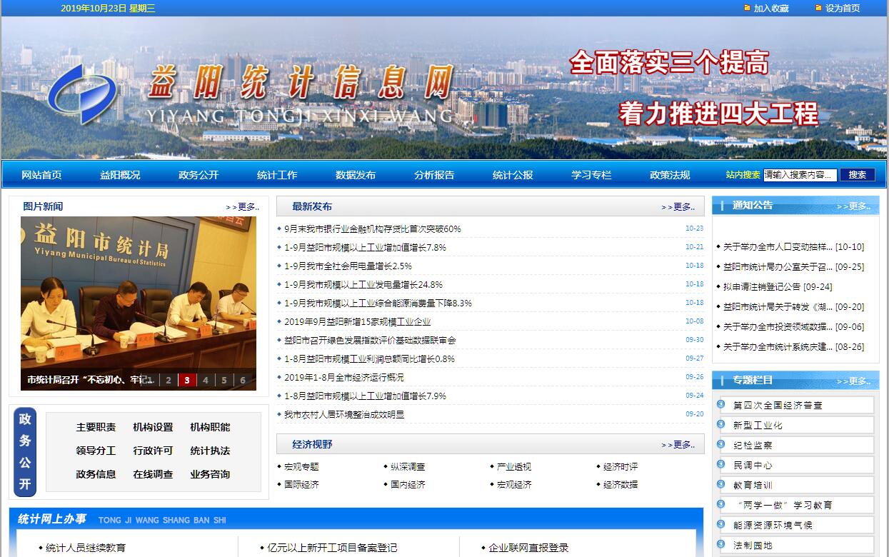 益阳市统计局主要职责:(一)拟定并组织实施全市统计改革和统计现代化建设规划及统计调查计划;建立健全全市国民经济核算体系和统计指标体系。(二)贯彻执行国家、省统计工作的方针、政策和统计法律、法规,完成国家、省统计调查任务;指导和协调全市统计业务工作;监督检查统计法律、法规的实施情况,查处各类统计违法行为;组织指导全市统计科研、统计教育、统计宣传工作。(三)组织开展全市人口、经济、农业等重大市情市力普查及有关专项调查;建立健全和管理全市统计信息自动化系统和统计数据库体系。(四)负责提供市委、市人民政府制订政策和编制国民经济和社会发展规划所需的统计资料,并对全市国民经济、科技进步和社会发展等情况进行统计分析、统计预测、统计检查和监督,向市委、市人民政府及其有关部门提供统计信息和咨询建议。(五)负责统一核定、管理、公布全市经济、社会、科技的基本统计资料,定期发布全市国民经济和社会发展情况统计公报以及有关普查和专项调查公报;发布社会经济统计信息。(六)负责依法审批或者备案市直各有关部门的统计调查计划及其调查方案。指导各基层单位加强统计基础建设。监督和管理全市中央统计事业经费;协助管理和考核区、县(市)统计局长、副局长。(七)完成市委、市政府交办的其他任务。