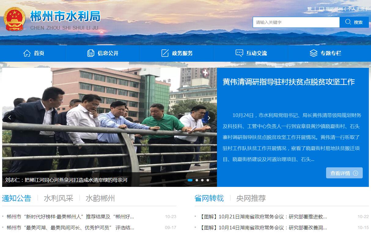 郴州市水利局主要职责:(一)负责保障水资源的合理开发利用。拟订全市水利战略规划和政策,组织编制市确定的重要江河湖泊流域综合规划、防洪规划等重大水利规划。(二)负责生活、生产经营和生态环境用水的统筹和保障。组织实施最严格水资源管理制度,实施水资源的统一监督管理,拟订全市和跨区域水中长期供求规划、水量分配方案并监督实施。负责重要流域、区域以及重大调水工程的水资源调度。组织实施取水监督、水资源论证和防洪论证制度,指导开展水资源有偿使用工作。指导全市水利行业供水和乡镇供水工作。(三)按规定制定水利工程建设和运行管理有关制度并组织实施,负责提出水利固定资产投资规模和方向、市财政性资金具体安排建议并组织指导实施,负责有关水利工程项目建议书、可行性研究报告审核和初步设计审查,提出水利资金安排建议并负责项目实施的监督管理。(四)指导水资源保护工作。组织编制实施水资源保护规划。指导饮用水水源保护有关工作。指导地下水开发利用、地下水资源管理保护。(五)负责节约用水工作。拟订节约用水政策,组织编制节约用水规划并监督实施,组织制定有关实施细则。组织实施用水总量控制等管理制度,指导和推动节水型社会建设工作。(六)联系市水文局工作。配合开展全市水文水资源监测和有关调查评价、信息发布等工作。(七)指导水利设施、水域及其岸线的管理、保护与综合利用。指导江河、湖泊、水库以及河口的治理、开发和保护。指导河湖水生态保护与修复、河湖生态流量水量管理以及河湖水系连通工作。承担河长制组织实施具体工作。(八)指导、监督水利工程建设与运行管理。组织、指导水利基础设施网络建设和运行管理。指导水利建设市场的监督管理,组织实施水利工程建设的监督。(九)负责水土保持工作。拟订水土保持规划并监督实施,组织实施水土流失的综合防治、监测预报并定期公告。负责建设项目水土保持监督管理工作,指导重点水土保持建设项目的实施。(十)指导农村水利工作。组织开展有关灌排工程建设与改造。指导农村饮水安全工程建设管理工作,指导节水灌溉有关工作。指导农村水利改革创新和社会化服务体系建设。指导农村水能资源开发、小水电改造和水电农村电气化工作。(十一)负责水利工程移民管理工作。拟订水库移民有关政策并监督实施,组织实施水利工程移民安置验收、监督评估等制度。指导、监督水库移民后期扶持政策的实施。协调推动水库移民对口支援等工作。(十二)指导、协调重大涉水违法事件的查处,协调跨县(市区)水事纠纷,指导水政监察和水行政执法。依法负责水利行业安全生产工作,组织、指导水库、水电站大坝等水利工程设施的安全监管。(十三)开展水利科技和外事工作。指导和监督实施湖南省水利行业地方技术标准、规程规范,组织开展水利行业质量监督工作。(十四)负责落实综合防灾减灾规划相关要求,组织编制洪水干旱灾害防治规划并指导实施。承担水情旱情监测预警工作。组织编制重要江河湖泊和重要水工程的防御洪水抗御旱灾调度及应急水量调度方案,按程序报批并组织实施。承担防御洪水应急抢险的技术支撑工作。承担台风防御期间重要水工程调度工作。(十五)完成市委、市政府交办的其他任务。