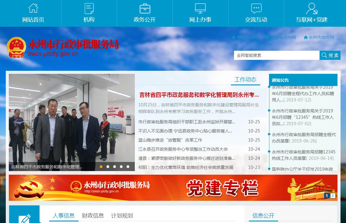 永州市行政审批服务局贯彻落实党中央关于行政审批服务方针政策和决策部署,在履责过程中坚持和加强党对行政审批服务工作的集中统一领导。其主要职责是:(一)推进、指导、协调、监督全市政务公开(政府信息公开、办事公开)和政务服务体系建设。承担市政务公开领导小组办公室的日常工作;拟订全市政务公开、政务服务工作发展规划和年度计划,建立和完善相应工作机制;统筹推进、协调监督市直各部门和各县区、管理区、经开区的政务公开和政务服务工作。(二)指导、协调、推进全市行政审批制度改革工作。承担市行政审批制度改革领导小组办公室的日常工作;拟订行政审批服务有关制度及管理办法并监督组织实施;牵头负责全市“放管服”改革工作。(三)统筹协调、规划指导、监督评估全市电子政务工作;统筹推进、协调监督全市“互联网+政务服务”工作;统筹规划、监督考核全市政府系统网站。(四)统筹协调、规划指导、监督评估全市政务信息化、大数据建设管理和应用等工作;组织协调推进政务数据资源共享和开放工作,统筹政务数据资源的采集、分类、管理、分析和应用工作。(五)承担市优化经济发展环境联席会议办公室的日常工作。负责全市优化营商环境工作的组织实施和监督、检查等工作;维护营商政务、法制、信用等环境;协调推进全市行政效能工作。(六)承担市社会信用体系建设领导小组办公室的日常工作。组织协调、监督推进全市有关国家、省社会信用体系建设的法律法规、决策部署的贯彻落实。拟订并组织实施全市社会信用体系建设的总体规划和政策措施;统筹推进统一的信用信息平台建设,促进信用信息资源的整合与运用,协调社会信用体系建设的重大问题;牵头组织对重点领域和严重失信行为实施联合惩戒。(七)承担市政务联动处置领导小组办公室的日常工作。负责拟订全市政务联动处置和城乡网格化建设管理工作规则;统筹规划、指挥协调、管理督导全市12345公共服务热线、政务联动处置和城乡网格化建设。(八)完成市委、市人民政府交办的其他任务。