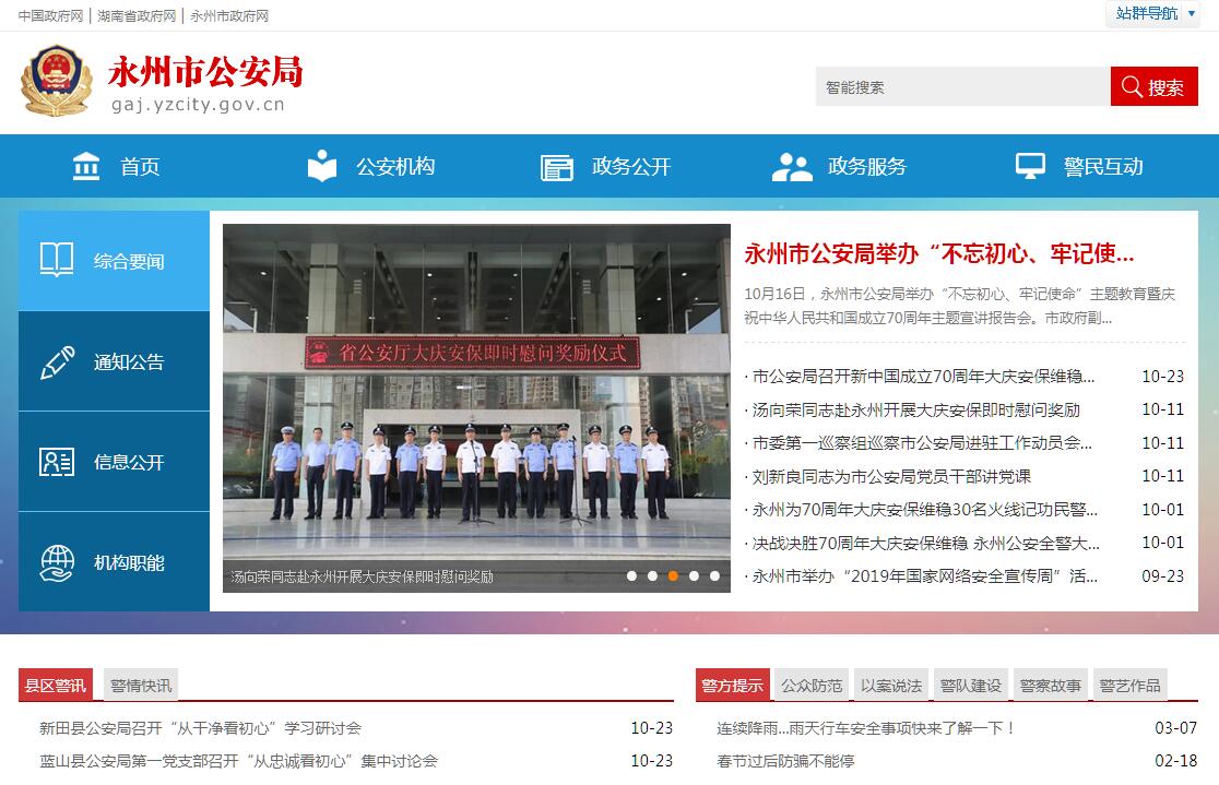 永州市公安局主要职责:一、贯彻执行国家有关公安工作的方针、政策和法律、法规,起草全市公安规范性文件;指导、监督、检查全市公安工作;二、掌握影响稳定、危害国内安全和社会治安的情况,分析形势,拟定对策。三、组织、指导和直接承办案件的侦查工作,协调、处置重大案件(事件)、治安事故和骚乱。四、指导、监督全市公安机关依法查处危害社会治安秩序的行为;依法管理危险物品、特种行业和公共场所等工作。五、依法管理国籍工作;负责出境、入境和外国人在境内居留、旅行的有关管理工作;指导协调涉外案件的查处。六、指导、监督全市消防工作;七、指导、监督全市公安机关维护道路交通安全、交通秩序以及机动车辆、驾驶员管理工作;指导、参与重大交通事故的查处;管理市公安局交通警察支队(市公安交通管理局)。八、指导、监督全市公安机关对国家机关、社会团体、企事业单位和重点建设工程的治安保卫工作以及群众性治安保卫组织的治安防范工作。九、指导、监督全市公安机关对公共信息网络的安全监察和通信工作。十、指导、监督全市公安机关依法承担的执行刑罚和监督、考察工作;指导、监督全市公安机关对看守所、治安拘留所、强制戒毒所、收容教养所等的管理工作;直接管理市看守所、治安拘留所(收容教养所)、强制戒毒所。 十一、负责全市公安机关收容教养审批工作;承担市人民政府劳动教养委员会的日常工作。十二、组织实施对来永的党和国家领导人以及重要外宾、重要会议的安全警卫工作。十三、组织、指导、监督全市公安机关开展禁毒、缉毒工作;承担市禁毒委员会的日常工作。十四、组织实施公安科学技术工作;规划公安信息技术、刑事技术和行动技术等建设。十五、指导全市公安机关装备、被装配备的计划、申报、分配、管理工作;负责申报公安业务经费和专项拨款的分配计划并监督、管理使用情况。十六、指导全市公安队伍建设;指导、管理公安机关人员培训、教育、奖惩、优抚及公安宣传工作和公安学校的工作,检查、监督落实情况;负责全市公安民警的警衔管理;按规定权限管理干部。十七、制订全市公安队伍监督管理工作规章制度,组织、指导全市公安机关警务督察工作;按规定权限实施对干部的监督;指导、督促、检查全市公安机关的执法活动;查处或督办公安队伍的重大违纪案件。十八、直接管理市区包括冷水滩区、凤凰园开发区社会治安和所属分局队伍建设工作。十九、承担市委、市人民政府和上级公安机关交办的其他工作。