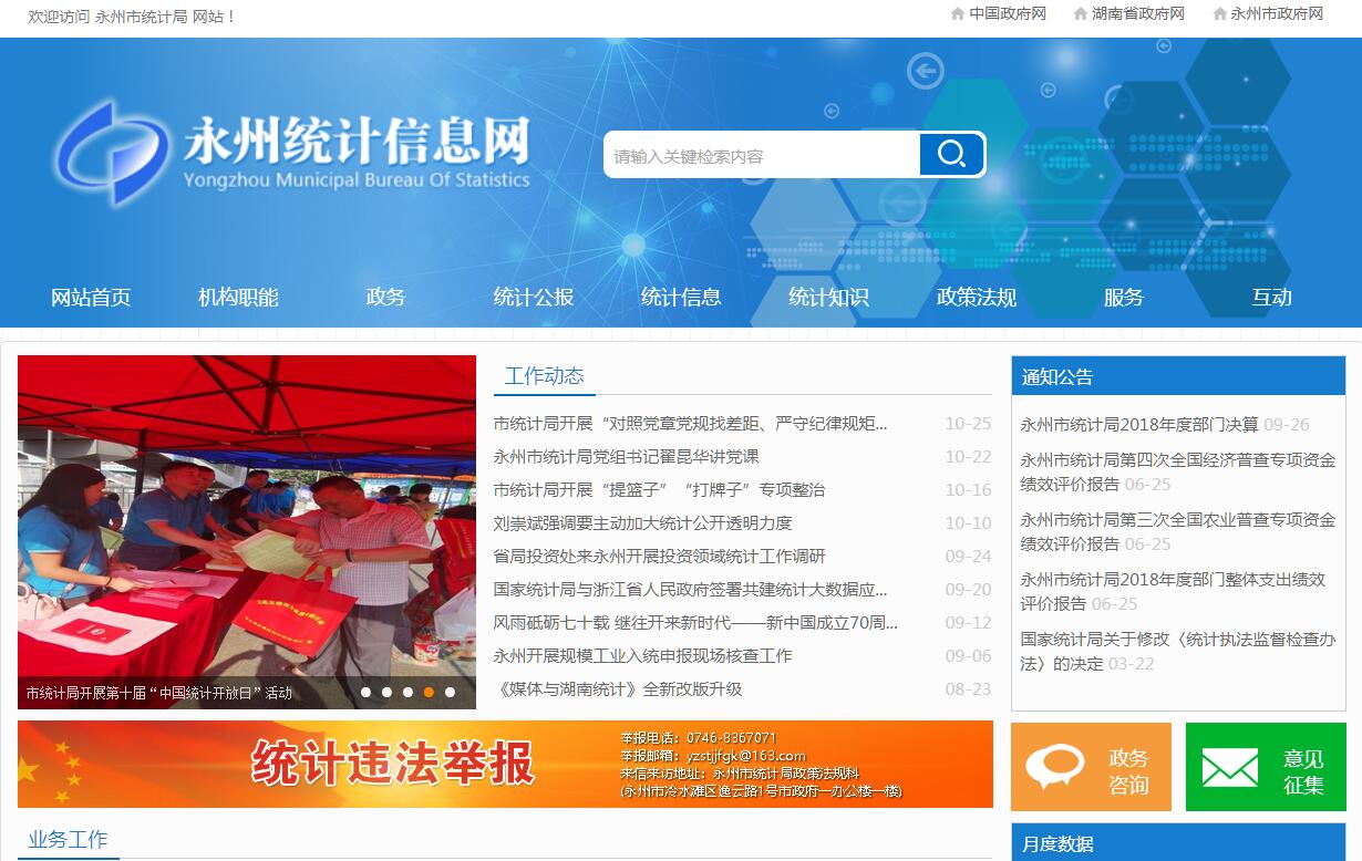 永州市统计局主要职责:1、贯彻执行国家统计局统计工作的方针、政策和统计法律、法规,研究统计制度和统计改革,完成国家统计调查任务;检查监督统计法规的实施情况,查处各类统计违法行为。2、制订并组织实施全市统计改革和统计信息化建设规划以及统计调查计划;建立健全国民经济核算体系和统计指标体系。3、指导和协调全市统计业务工作,组织开展全市性的市情市力普查及有关专项调查;审核市直各部门的统计调查计划及其调查方案。4、为市委、市人民政府编制国民经济和社会发展规划提供统计资料,并对全市国民经济、科技进步和社会发展等情况进行统计分析、预测、检查和监督,向市委、市人民政府及其有关部门提供统计信息和咨询建议。5、统一核定、管理、公布全市经济、社会、科技的基本统计资料,定期发布全市国民经济和社会发展情况统计公报以及有关普查和专项调查公报;公布社会经济统计信息。6、建立健全和管理全市统计信息自动化系统和统计数据库体系;指导各级基层单位加强统计基础建设。7、组织协调全市城市、农村、企业调查工作。8、协助地方管理和考核县、区统计局正副局长;会同有关部门承办全市统计专业资格考核和职务评审有关工作;组织指导全市统计科研、统计教育、统计宣传工作。9、承办市委、市人民政府交办的其他事项。