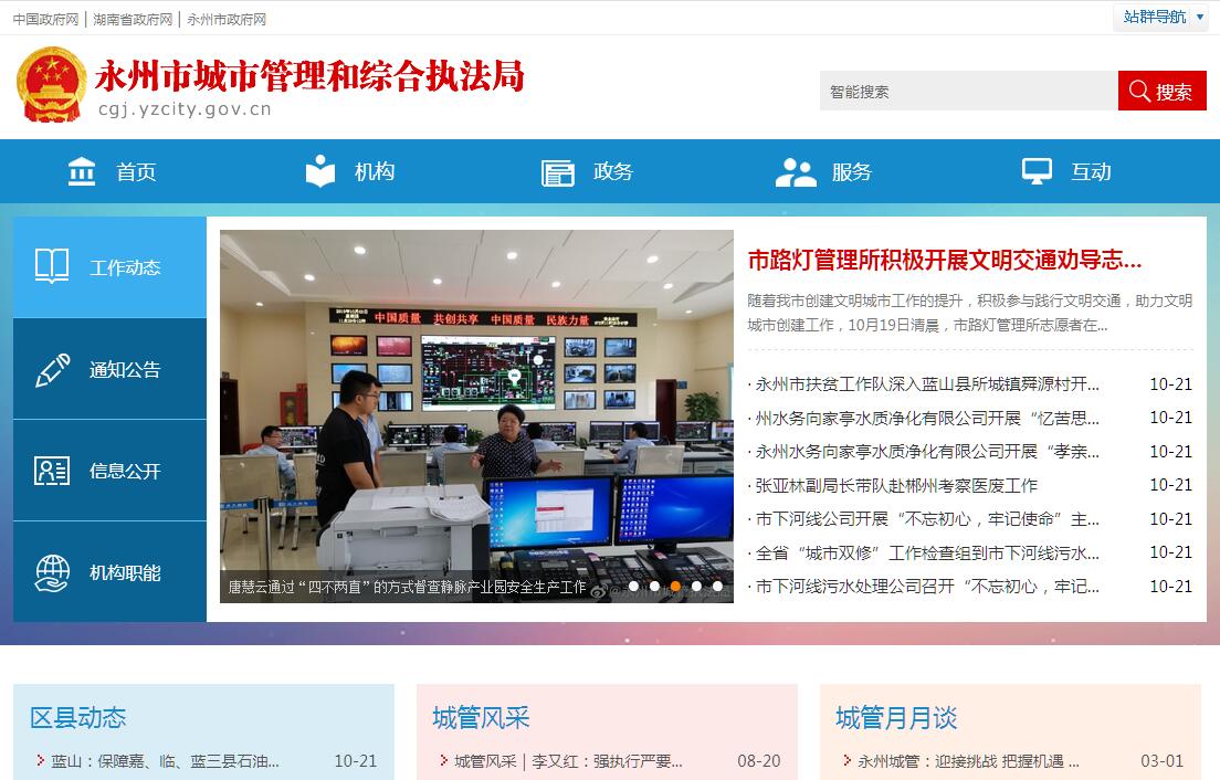 永州市城市管理行政执法局,为市人民政府工作部门。其主要职责是:(一)行使市容环境卫生管理方面法律、法规、规章规定的行政处罚权;行使城市公用事业管理方面(城市公共交通、给排水、照明设施、燃气热力等)法律、法规、规章规定属城市公共管理领域的行政处罚权;行使市政管理方面法律、法规、规章规定的行政处罚权。(二)行使城乡规划管理方面法律、法规、规章规定的部分行政处罚权(不包括已办理规划报建手续的规划违法案件的行政处罚权);行使环境保护管理方面法律、法规、规章规定的部分行政处罚权。(三)行使工商行政管理方面法律、法规、规章规定的对无照商贩或离开指定场地到公共场所经营的有照商贩的行政处罚权;行使在店外经营或店外作业商贩的行政处罚权;行使对违规设置户外广告行为的行政处罚权;对破损或者残缺等影响市容的广告行为的行政处罚权。(四)行使公安交通管理方面法律、法规、规章规定的在机动车道以外乱停乱放车辆、挡路摆摊设点、堆放物料等占用城市道路行为的行政处罚权以及法律、法规、规章规定对违反烟花爆竹的销售、燃放规定行为的行政处罚权。中心城市冷水滩城区范围内上述四项职责由市城市管理行政执法局冷水滩分局具体组织实施。(五)负责宣传和贯彻落实城市管理相关法律、法规和规章,组织开展城市管理行政执法调查研究,总结推广城市管理行政执法工作经验。(六)负责中心城市城市管理的综合协调、检查监督、考核评比和培训工作。(七)负责贯彻执行城市公用事业管理相关法律、法规和政策,研究制定中心城市环境卫生、给排水、污水处理、燃气热力、城市照明设施、城市垃圾集中处置等行业的中长期规划和年度计划并负责组织实施。(八)负责组织实施国家制定的城市市容环境卫生标准定额和行业规范;负责制定中心城区市容环境卫生管理工作的相关规章制度;指导和督查中心城市冷水滩城区的环境卫生工作。(九)负责中心城市冷水滩城区户外广告、标语牌、霓虹灯、画廊、橱窗等场地的规划制定,经市规划委员会审定后组织实施拍卖、招租等具体管理行为;负责中心城市冷水滩城区占破道的审批和管理。(十)负责编制中心城市车辆清洗行业发展规划,负责制定中心城区车辆车容车貌的管理规范,监督管理中心城市冷水滩城区车辆清洗场(站)。(十一)负责中心城市的城市给排水(含二次供水)和计划用水、节约用水管理工作;负责城市排水许可证审定核发;负责全市城镇供水的水质监测和指导,管理中心城市污水处理工作和污水管道维护工作;负责中心城市城区垃圾集中处置的管理工作和垃圾处理场的营运、管理工作;负责全市医疗废弃物集中处置的管理工作。(十二)负责中心城市冷水滩城区城市燃气热力管理,包括燃气安全管理、资质管理、器具安装使用维修监督管理等,规范燃气热力市场;负责中心城市冷水滩城区公共照明设施的发展规划和年度计划并组织实施;审核中心城市零陵城区公共照明设施的发展规划和年度计划并指导组织实施。(十三)负责局机关和所属单位的干部人事、劳动工资、机构编制、退(离)休人员管理服务工作;负责局机关和直属单位的党群工作、纪检监察工作、精神文明建设和职工队伍建设。(十四)承办市人民政府交办的其他事项。