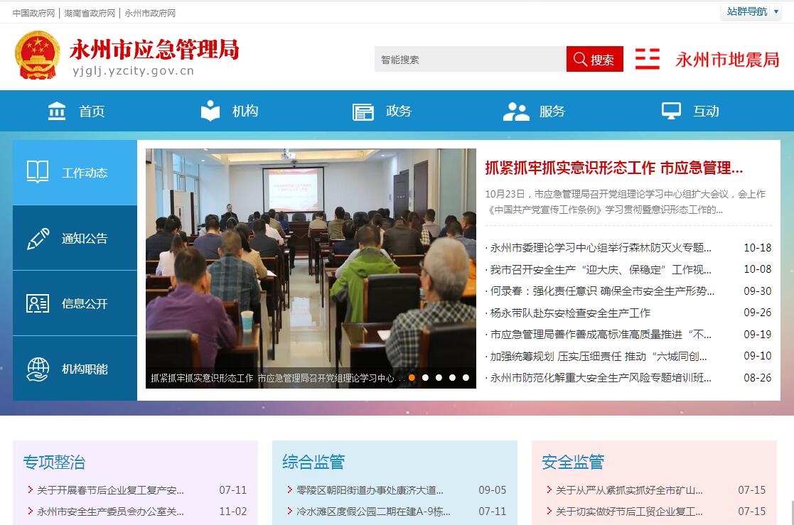 永州市应急管理局是市政府主管安全生产的综合监督管理部门。其主要职责是:(一)承担市安全生产委员会办公室的日常工作;研究提出安全生产重大方针政策和重要措施的建议;监督检查、指导协调市政府有关部门和各县区政府、金洞林场、回龙圩管理区的安全生产工作,检查落实安全生产责任制和生产安全事故责任追究制;组织全市安全生产大检查、专项督查和安全生产专项整治;参与研究有关部门在产业政策、资金投入、科技发展等工作中涉及安全生产的相关工作;负责组织市内重大事故调查处理和办理结案工作;组织协调重大事故应急救援工作;指导协调全市安全生产行政执法工作;承办市安全生产委员会召开的会议和重要活动,督促、检查安全生产委员会会议决定事项的贯彻落实情况;承办市安全生产委员会交办的其他事项。(二)综合管理全市安全生产工作。组织起草安全生产方面的规范性文件,研究拟定安全生产工作的办法措施及规定;监督检查有关部门及工矿商贸行业贯彻落实国家、省安全生产规章规程和安全生产标准的情况。(三)依法行使市政府安全生产综合监督管理职权,指导、协调和监督有关部门安全生产监督管理工作;制定全市安全生产发展规划;定期分析和预测全市安全生产形势,研究、协调和解决安全生产中的重大问题。(四)负责发布全市安全生产信息,综合管理全市生产安全伤亡事故调度统计和安全生产行政执法分析工作,按规定上报伤亡事故情况;依法组织、协调重大、特大事故的调查处理工作,并监督事故查处的落实情况;组织、指挥和协调安全生产应急救援工作,受国家、省安全生产监督管理局的委托,参与协助特别和特大事故的调查处理。(五)负责综合监督管理危险化学品和烟花爆竹的安全生产工作。(六)指导、协调全市安全生产检测检验工作;组织实施对工矿商贸企业安全生产条件和有关设备(特种设备除外)进行检测检验、安全评价、安全培训、安全咨询等社会中介组织的资质管理工作,并进行监督检查。(七)组织、指导全市安全生产宣传教育工作,负责安全生产监管人员的安全培训、考核工作;依法组织、指导并监督全市特种作业人员(特种设备作业人员除外)的考核工作和生产经营单位主要经营管理者、安全管理人员的安全资格考核工作;监督检查生产经营单位安全培训工作。(八)负责监督管理市属工矿商贸企业安全生产工作,依法监督工矿商贸企业贯彻执行安全生产法律、法规和有关规章、规程及技术标准的情况,监督检查其安全生产条件和有关设备(特种设备除外)、材料、劳动防护用品的安全管理工作情况,依法查处其违法、违规行为和不具备安全生产条件的生产经营单位。(九)根据《行政许可法》、《安全生产许可证条例》及有关的法律、法规和国家标准或行业标准规定的安全生产条件与程序,对涉及安全生产需要审查批准(包括批准、核准、许可、注册、认证、颁发证照等)或验收的事项,进行审批、审核或验收;对未依法取得批准或验收合格的单位擅自从事有关活动的,依法予以查处;对取得批准后不再具备安全生产条件的,依法撤销原批准。(十)依法监督检查新建、改建、扩建工程项目可行性研究的安全评价及安全设施与主体工程同时设计、同时施工、同时投产使用(简称"三同时")情况;依法监督检查生产经营单位作业场所职业卫生情况和重大危险源监控、重大事故隐患的整改情况。(十一)督促、指导县区级安全生产监督管理部门在分管区域和职责范围内做好安全生产和监督管理工作。(十二)拟定全市安全生产的发展规划与科技规划,组织、指导安全生产重大科学技术研究、科研成果鉴定和先进技术推广、示范工作。(十三)归口管理国家和省级、市级安全技术改造、安全技术措施、公共安全重大事故隐患治理等安全生产专项资金项目,并监督检查其资金的使用情况;监督检查生产经营单位安全生产所必需资金的投入及安全生产费用的提取和使用情况。(十四)协同有关部门组织实施注册安全工程师执业资格制度,监督指导注册安全工程师执业资格考试和注册工作。(十五)组织开展安全生产方面的国内外交流与合作。(十六)协调煤矿安全监察工作。(十七)承办市政府、市安全生产委员会及省安全生产监督管理局交办的其他事项。