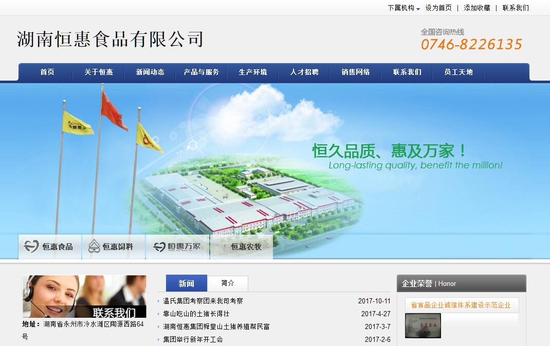 湖南恒惠集团是集种植—饲料加工—种猪扩繁—生猪养殖—生猪屠宰分割—肉制品深加工—冷储冷藏—农产品冷链物流—商贸连锁为一体的湖南省农业产业化企业,成立于1998年12月,总部设在湖南省永州市冷水滩区林荫路凤凰工业园,目前集团下属单位有湖南恒惠饲料有限公司、湖南恒惠食品有限公司、湖南恒惠农牧有限公司、湖南恒惠商贸连锁有限公司。荣获了“湖南省著名商标”“出口食用动物(猪)饲用饲料定点生产企业”“出口食品生产企业”“湖南省农业产业化十佳诚信企业”“湖南省农业产业化副会长单位”“湖南省饲料工业协会副会长单位”“湖南省肉类协会副会长单位”“永州市优秀企业”等一系列荣誉。集团始终围绕“农”字做文章,围绕生猪加工上项目,不断进行管理创新、技术创新、市场创新、企业实现了持续、快速、健康发展;销售收入由1998年建厂初期的300多万元,2005年突破1亿元,2015年已达到6.39亿元。力争三年内完成股份制改造,实现股票成功上市。集团注重对永州地方猪品种——舜皇山土猪的保护与开发。舜皇山土猪,产于东安县舜皇山一带,因此又名东安猪,作为一个古老的地方猪品种,距今已有2000年历史。2006年,公司斥巨资建立舜皇山土猪保种场,2012年,舜皇山土猪获国家地理标志保护产品。为培植好这个品牌,集团推行“公司+协会+家庭农场”的标准化生产,养殖户与公司签订舜皇山土猪生态养殖合同,严格ISO9001:2008质量管理体系实施。目前,集团已建有高标准的舜皇山土猪原种场1个;舜皇山土猪生产基地30个,发动100多个村1000多户养殖农户从事舜皇山土猪养殖,存栏猪1.8万头。公司具有年产21万吨的无抗饲料生产加工基地,农牧基地占地一千余亩,被省农业厅认定为湖南省无公害农产品基地,基地拥有原种猪一级扩繁场1个、大型标准化规模养殖场2个,年出栏种猪2万余头,生猪20万余头;舜皇山土猪养殖基地,是中国南部地区规模较大的地方优良品种猪保种基地,被国家农业部认定为“生猪标准化示范场”。肉制品深加工基地拥有按五星级标准建设的年屠宰100万头的生猪屠宰场、先进的万吨级的智能化冷库、年加工肉制品3万吨的现代化生产线。集团坚持用大思路发展现代肉食工业,引进先进的设备1000多套台,形成了以屠宰和肉制品加工业为主,养殖业、屠宰业、肉制品加工业、物流配送、商贸连锁等主业突出、行业配套的产业群。集团坚持用现代物流业改造传统的屠宰业,率先把冷鲜肉的“冷链生产、冷链配送、冷链销售、连锁经营”模式引入永州市,大力推广冷鲜肉的品牌化经营,实现热鲜肉、冷冻肉向冷鲜肉转变,传统销售向连锁经营转变,改变传统的“沿街串巷、设摊卖肉”旧模式,结束了永州卖肉没有品牌的历史,引导了行业的发展方向,恒惠开创永州肉类品牌。公司主要的产品有“恒惠”牌系列肉制品及高端产品“舜皇山土猪肉”系列,主要包括冷鲜肉、腌腊制品、酱卤制品、西式火腿、西式灌肠、高温火腿肠、发酵肉制品、休闲食品、辣酱等系列产品。产品荣获了“湖南名牌产品”“湖南省农产品加工质量安全奖”“湖南省十大市场畅销农产品品牌”等荣誉称号。