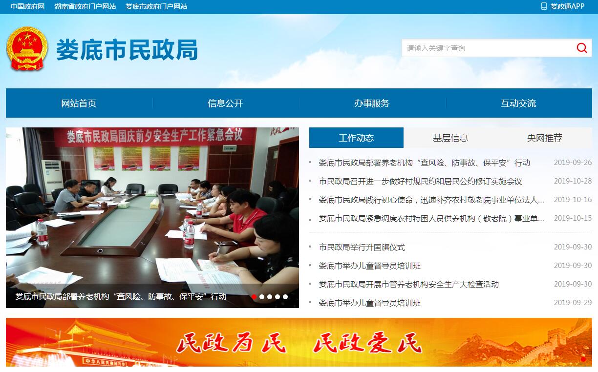 娄底市民政局是娄底市人民政府主管有关社会行政事务的职能部门。贯彻执行党和国家关于民政工作的方针、政策和法律法规,做好“三项服务”,即:为最广大的人民群众服务,为最需要帮助的困难群众服务,为改革发展稳定的大局服务。其主要职责是:一、贯彻执行国家和省有关民政工作的法律、法规和方针、政策,制定全市民政事业发展规划和工作计划,并组织实施;指导基层民政组织建设。二、负责全市性社团和民办非企业单位的登记管理工作,依法监督民间组织活动,保障其合法权益,查处违法行为。三、负责优待抚恤和烈士褒扬工作,负责革命烈士、因公致残人员的报批工作。指导优抚事业单位和革命烈士纪念物、建筑物管理。四、组织指导拥军优属、拥政爱民工作;承担市双拥领导小组办公室的日常工作。五、负责复员、退伍军人、转业士官和军队离退休干部、军队无军籍退休、退职职工的安置管理工作;指导军用饮食供应站、光荣院和军队离退休干部休养所的建设、管理工作。六、组织、协调全市救灾工作,核查上报灾情,接收、管理、分配救灾款物;指导灾区进行灾民生活救济和开展生产自救;组织向贫困地区捐赠衣被等活动。七、管理全市社会救济工作;组织、实施城市居民最低生活保障制度及建立健全农村特困户救助制度和城乡医疗救助制度,并对全市工作进行指导、监督、检查;指导农村五保供养和敬老院建设管理工作。八、指导城乡基层政权和基层群众自治组织建设;开展村民自治活动、完善村务公开工作,推进社区建设,指导社区服务管理工作。九、承办行政区划有关工作;负责行政区域界线的勘定和日常管理工作,调查和调处行政区域边界争议;主管全市地名管理工作;设置、管理地名标志,推行地名标准化。十、承担老人、孤儿等特殊困难群体权益保护和行政管理工作;指导社会福利事业单位的建设与管理工作。十一、指导城市生活无着落的流浪乞讨人员的救助管理工作。十二、主管婚姻登记管理工作;承办涉港、澳的婚姻登记。十三、负责儿童收养登记工作。十四、承办市人民政府和上级民政机关交办的其他事项。