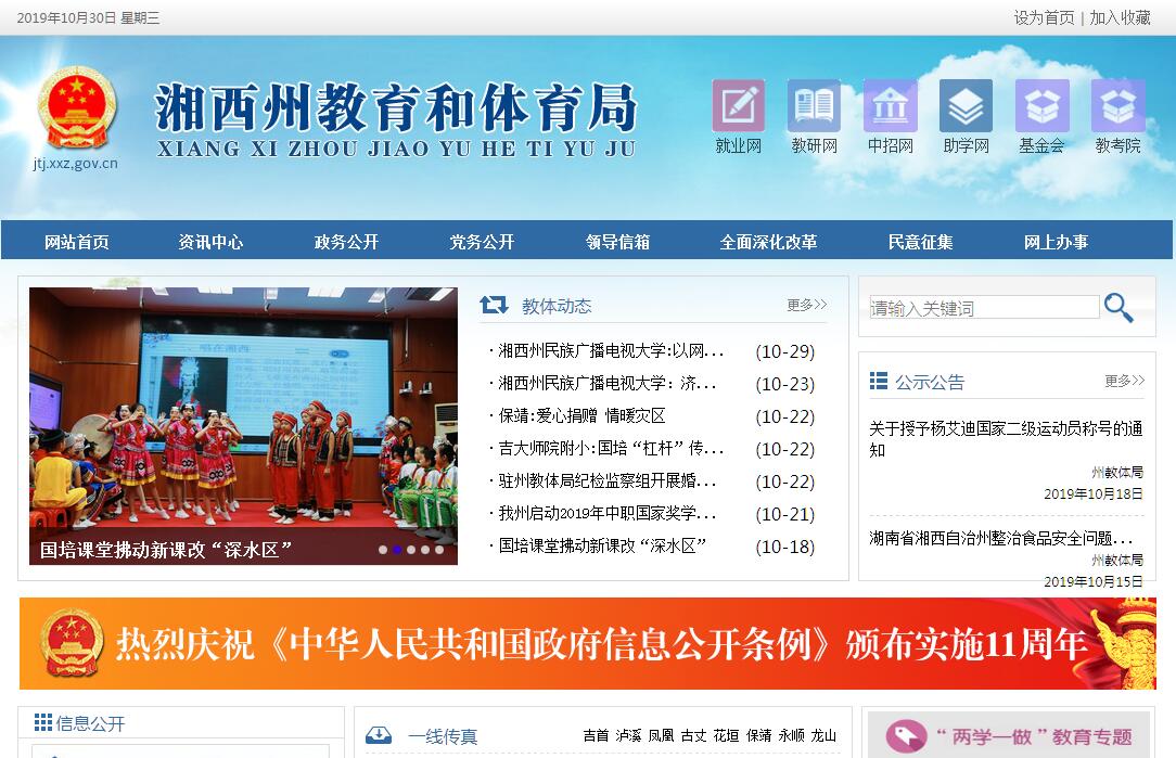 湘西州教育和体育局主要职责:(一)贯彻落实国家教育体育工作方针、政策和法律、法规、制度。(二)研究提出全州教育体育改革与发展战略和教育体育事业发展规划,拟定教育体育体制改革的政策以及教育体育发展的重点、结构、速度,指导并协调实施工作。(三)依法依规管理教育体育经费,负责管理分配本级教育体育预算经费和上级下拨的资金;参与拟订筹措教育体育经费、拨款、基建投资的政策法规;监测全州教育体育经费的投入和使用情况;按有关规定管理国内外政府及组织对全州的教育体育援助和贷款;指导并管理资助大中小学校经济困难学生工作。(四)依法依规主管全州教师、教练工作。依法履行中小学教师、教练的资格认定、招聘录用、职务评聘、培养培训、调配交流、档案管理和考核奖惩等管理职能;监督执行国家制定的各级各类学校编制标准;统筹规划学校教师和校长队伍建设;负责优秀运动员退役安置工作;负责全州语言文字工作。(五)按有关规定负责全州高中阶段教育各类学校的设置、更名、撤销与调整的审核、报批工作;指导高等、中等及其以下各类教育的教育教学改革;组织实施普及九年义务教育、学前教育。(六)组织管理普通初中毕业学业考试;指导各级各类学校的思想政治教育工作、德育工作、体育卫生与艺术教育及国防教育工作。(七)统筹管理各类高等、中等学历教育的考试招生工作;负责中小学学籍和幼儿园园籍管理工作;指导高等、中等学校毕业生就业制度改革,负责毕业生就业指导服务。(八)统筹管理中小学、体育学校和幼儿园教材、配套用书、教辅资料和音响制品、图书及现代化教育技术工作。(九)负责全州教育体育基本信息的统计、分析和发布工作。(十)贯彻落实全民健身条例,指导并开展群众性体育活动,实施国家体育锻炼标准,开展国民体质监测;负责全州社会体育指导员等级的审核和核准工作,指导公共体育设施的建设,负责公共体育设施的监督管理。(十一)统筹规划全州青少年体育和竞技体育发展,指导全州体育教育教学、业务训练和体育竞赛工作,规划全州体育训练项目的布局,指导各级各类业余体育学校和单项体育运动学校的建设工作;指导各级各类学校体育教育教学、业余训练、体育竞赛;负责全州运动员的登记核准和申报工作;协同有关部门制定优秀运动员奖励的政策和标准。(十二)制定全州性体育竞赛计划,指导全州性体育竞赛工作;负责全州裁判员的业务培训和等级申报、核准工作;组织举办全州大型综合性体育竞赛,承办或参加全国、全省综合性运动会单项体育竞赛。(十三)负责体育彩票发行管理。(十四)贯彻国家有关涉外方针政策,开展国际间和与香港、澳门特别行政区及台湾地区的教育体育结合与交流,组织参加和承办国际体育竞赛,承担上级主管部门交给的外事任务。(十五)组织开展体育科研和反兴奋剂工作。(十六)制定全州体育经济和经营活动的有关办法,发展体育市场;依法审查体育经营活动从业资格。(十七)负责协调、指导、督促各级各类学校落实安全维稳措施。(十八)承担州人民政府教育督导实施工作;组织、指导全州体育督查工作。(十九)协助州委组织部考察和管理学校领导班子和领导干部。(十二)承办州人民政府交办的其他事项。