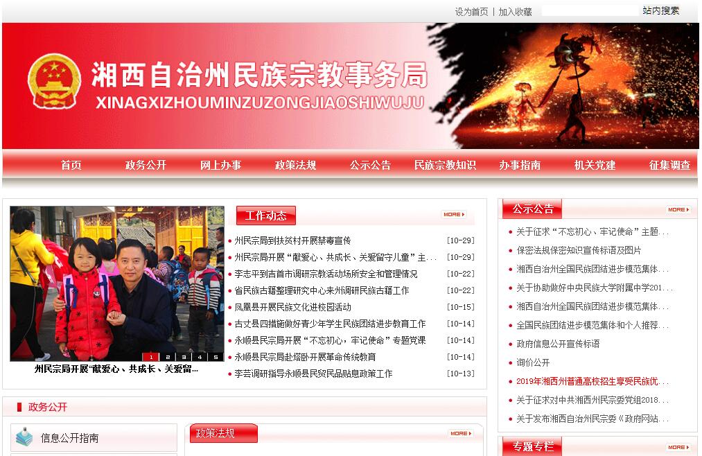 湘西州民族宗教事务局主要职责:(一)贯彻落实党和国家关于民族宗教工作的方针、政策、法律、法规以及省委、省政府和州委、州政府的决策部署;负责起草有关民族宗教事务的地方性法规、规章草案,组织拟订民族宗教相关工作政策,并督促检查落实;指导实施和完善民族区域自治制度建设,保障少数民族的合法权益。(二)组织开展民族宗教理论、政策和问题的调查研究,提出有关民族宗教工作的政策建议。(三)负责协调推动有关部门履行民族宗教工作相关职责;促进民族宗教政策在经济发展和社会事业有关领域的实施、衔接; 对全州民族宗教工作进行业务指导。(四)研究提出协调民族关系、宗教关系的工作建议,会同有关部门处理民族关系、宗教关系中的重大事项;参与协调民族地区社会稳定工作,促进各民族共同团结奋斗、共同繁荣发展,维护国家统一。(五)组织拟订全州少数民族事业发展专项规划,监督检查规划实施情况;参与制定少数民族和民族地区经济社会相关领域的发展规划;促进建立和完善少数民族事业发展综合评价监测体系;推进实施民族宗教事务服务体系和管理信息化建设。(六)研究分析全州经济发展和社会事业方面的问题并提出特殊政策建议;组织协调或参与实施州委、州政府部署的民生工 程相关工作;参与西部开发、武陵山片区区域发展与扶贫攻坚事 宜;参与组织协调民族地区科技发展、对口支援、经济技术协作、民族贸易、民族特需用品生产及优惠政策落实等相关工作;负责 全州少数民族发展资金的管理和使用工作。(七)负责组织指导全州民族宗教方面的法律法规、政策及基本知识的宣传教育工作;组织开展民族团结进步创建活动;承办州政府民族团结进步表彰活动;指导城市民族工作,协调城市民族关系;开展发放清真标志牌和清真生产企业改变服务方向服务工作。(八)负责管理全州少数民族语言文字工作,指导少数民族语言文字的教学、翻译、编辑、出版和民族古籍的搜集、整理、出版、研究工作;负责少数民族文艺调演的组织参演工作;负责少数民族传统体育运动会的组团参赛工作。(九)依法履行宗教事务管理职责,依法保护公民宗教信仰自由和正常的宗教活动,维护宗教界合法权益,促进宗教关系和谐。(十)指导宗教团体依法依章开展活动,支持宗教团体加强自身建设,推动宗教团体在宗教界开展爱国主义、社会主义和维护祖国统一、民族团结的自我教育;指导和管理全州宗教自养企事业,办理成立、变更、注销州级宗教团体审核和宗教活动场所设立(改建、扩建、新建、重建)审批及财务监督工作,做好在华外国人集体进行临时宗教活动地点审批。(十一)指导县市民族宗教事务部门依法履行管理职责,防范利用民族宗教进行的非法、违法活动,抵御境外利用民族宗教进行的分裂、渗透、破坏活动,配合有关部门做好防范和处置邪教问题。(十二)负责民族宗教事务方面的外事管理工作,组织指导民族宗教工作领域有关对外和对港澳台的交流、交往与合作;参与涉及民族宗教事务的对外宣传工作;加强同民族自治地方的联系,组织接待少数民族团体学习、参观、考察等事宜。(十三)参与拟订少数民族干部人才队伍、宗教工作队伍建 设规划,研究提出少数民族干部队伍建设的政策建议,联系少数民族干部和宗教界代表人士,协助有关部门做好少数民族干部的 培养、教育和使用等工作;管理和指导全州宗教工作干部的政治业务培训,负责骨干宗教教职人员的思想教育工作。(十四)承办州人民政府交办的其他事项。