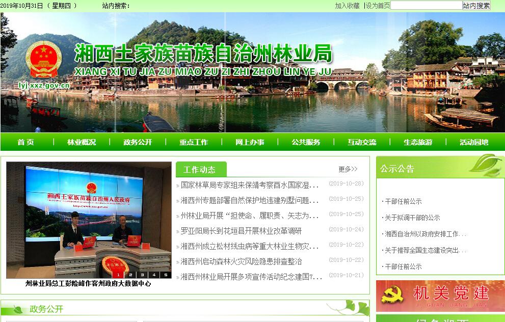 湘西州林业局主要职责:(一)负责全州林业及其生态建设的监督管理。拟订林业及其生态建设的方针政策、发展战略、中长期规划,并组织实施。拟订绿色湘西、森林生态环境、国土绿化建设的政策,参与绿色湘西建设山清水秀的生态环境工程、低碳环保的绿色生产体系、可持续利用的绿色消费体系、和谐共生的绿色文化体系等四大体系构建。组织开展森林资源、陆生野生动植物资源、湿地和荒漠的调查、动态监测和评估。承担林业生态文明建设的有关工作。(二)组织、协调、指导和监督全州造林绿化工作。制定全州造林绿化的指导性计划。指导、监管各类生态公益林和商品林的培育工作,组织指导林木种苗、林木花卉工作,指导植树造林、封山育林和以植树种草等生物措施防治水土流失工作,指导、监督全民义务植树、造林绿化工作。承担林业应对气候变化的相关工作。承担州绿化委员会的具体工作。(三)承担森林资源保护发展监督管理的责任。组织、监督林业资源保护管理。组织编制并监督执行全州森林采伐限额,监督检查林木凭证采伐、运输,组织、指导林地、林权管理,组织实施林权登记、发证工作,拟订林地保护利用规划并指导实施,依法承担应由州政府批准的林地征用、占用的审批。协助管理重点国有林区的国有森林资源。(四)组织、协调、指导和监督全州湿地保护工作。拟订全州性、区域性湿地保护规划。组织实施建立湿地保护小区、湿地公园等保护管理工作。组织、监督湿地的合理利用。组织、协调全州湿地保护和有关国际湿地公约的履约工作。(五)组织、协调、指导和监督全州石漠化防治工作。组织拟订全州石漠化防治封禁保护区建设规划,监督石漠化土地的合理利用。(六)组织、指导陆生野生动植物资源的保护和合理开发利用。监督管理全州陆生野生动植物猎捕或采集、驯养繁殖或培植及经营利用;监督管理野生动植物进出口。(七)负责林业系统自然保护区的监督管理。在国家和省级自然保护区区划、规划原则的指导下,依法指导森林、湿地、荒漠化和陆生野生动物类型自然保护区的建设和管理,监督管理林业生物种质资源、林业转基因生物安全、植物新品种保护。按分工负责生物多样性保护的有关工作。(八)承担推进林业改革,维护农民经营林业的合法权益的责任。拟订全州农村林业发展、维护农民经营林业合法权益的政策措施,指导、监督农村林地承包经营和林权流转,指导林权纠纷调处和林地承包合同纠纷仲裁。依法负责退耕还林工作。指导国有林场(苗圃)、集体林场、森林公园和基层林业工作机构的建设和管理。(九)制定全州林业产业发展政策,合理调整林业产业发展布局,促进林业产业协调发展。监督检查各产业对森林、湿地、荒漠和陆生野生动植物资源的开发利用。制定林业资源优化配置政策,按照国家和省有关规定,组织指导林产品质量监督。指导山区综合开发。负责油茶等经济树种的开发利用工作。(十)承担组织、协调、指导、监督全州森林防火工作的责任。承担州森林防火指挥部的具体工作。承担林业行政执法监管的责任,指导全州森林公安工作,监督管理森林公安队伍,指导全州林业重大违法案件的查处。指导林业有害生物的防治、检疫工作。(十一)参与拟订林业及其生态建设的财政、金融、价格、贸易等经济调节政策,组织、指导林业及其生态建设的生态补偿制度的实施。编制全州林业及其生态建设的年度生产计划。(十二)组织、指导林业及其生态建设的科技工作,指导全州林业队伍的建设。(十三)承办州人民政府交办的其他事项。