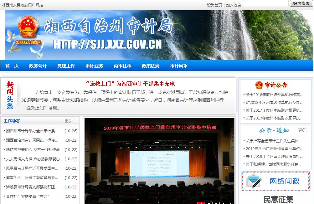 湘西州审计局主要职责:(一)贯彻执行国家关于审计工作的方针、法律法规和政策,研究拟订全州审计工作的方针、政策,参与制订全州审计、财经方面的政策和法规,制订审计业务规章制度和工作规划,并监督执行。(二)对州本级财政预算执行情况和其他财政收支情况进行审计监督。向州人民政府提交年度州本级预算执行和其他财政收支的审计结果报告,受州人民政府委托向州人大常委会提出州本级财政预算执行和其他财政收支情况的审计工作报告、审计发现问题的纠正和处理结果报告。依法向社会公布审计结果。(三)对县市人民政府预算的执行情况和决算进行审计监督。(四)对州属国有及国有控股企业的资产、负债和损益情况进行审计监督。(五)对地方金融机构的财务收支和资产、负债及损益情况进行审计监督。(六)对州政府部门管理和其他单位受州政府委托管理的社会保障基金、环境保护资金、社会捐赠资金及其他有关基金、资金的财务收支进行审计监督。(七)对州政府接收的国际组织和外国政府援助、贷款项目以及赠款项目的财务收支进行审计监督。(八)对州直各部门、事业单位及其下属单位的财务收支和专项资金使用情况进行审计监督。(九)对州政府投资和以州政府投资为主的建设项目的预算执行情况和工程决算进行审计监督。(十)对法律、法规规定应由州审计局进行审计的其他事项进行审计监督。(十一)组织实施对国家财政法律法规、宏观调控措施等与国家财政收支有关的特定事项进行行业审计、专项审计或审计调查,并向省审计厅、州政府和有关部门反映情况,提出建议。(十二)实施对州管党政领导干部和州属国有及国有控股企业负责人经济责任审计。(十三)指导和监督内部审计工作,监督社会审计组织的审计业务质量;组织审计专业培训。(十四)与县市人民政府共同领导县市审计机关,按照干部管理权限协同办理县市审计机关负责人的任免事项。依法领导和监督县市审计机关业务。(十五)与有关部门共同组织开展审计领域的对外交流活动。(十六)承办州人民政府交办的其他事项。
