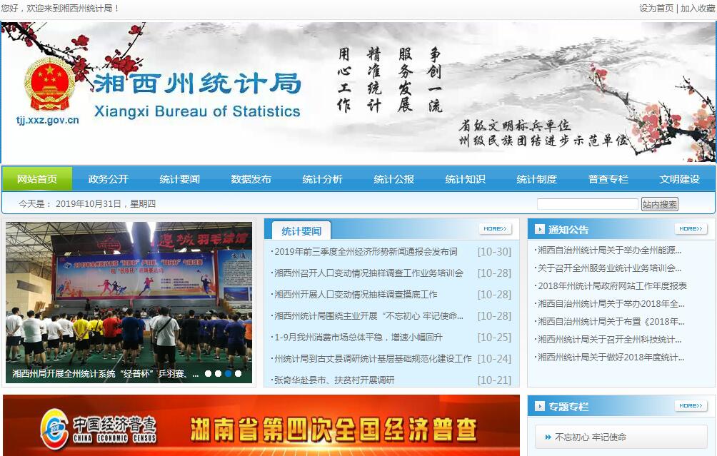 湘西州统计局主要职责:(1)贯彻执行国家统计工作的方针、政策和统计法律法规,完成国家和地方统计调查任务;承担组织领导和协调全州统计工作,确保统计数据真实、准确、及时;监督检查统计法律法规的实施情况,查处各类统计违法行为。(2)制定并组织实施全州统计改革和统计现代化建设规划及统计调查计划,建立健全国民经济核算体系和统计指标体系,组织实施全州及各县市国民经济核算和全州投入产出调查,核算全州及县市国内生产总值,汇编提供国民经济核算资料,监督管理全州各县市国民经济核算工作。(3)会同有关部门拟订重大州情州力普查计划与方案,组织实施全州人口、经济、农业等重大州情州力普查,汇总、整理和提供有关州情州力方面的统计数据。(4)组织实施农林牧渔业、工业、建筑业、批发和零售业、住宿和餐饮业、房地产业、租赁和商务服务业、居民服务和其他服务业、文化体育和娱乐业以及装卸搬运和其他运输服务业、仓储业、计算机服务业、软件业、科技交流和推广服务业、社会福利业等统计调查,收集、汇总、整理和提供有关调查的统计数据,综合整理和提供地质勘查、旅游、交通运输、邮政、教育、卫生、社会保障、公用事业等全州性基本统计数据。(5)组织实施能源、投资、消费、价格、收入、科技、人口、劳动力、社会发展基本情况、环境基本状况等统计调查,收集、汇总、整理和提供有关调查的统计数据,综合整理和提供资源、房屋、对外贸易、对外经济等全州性基本统计数据。(6)组织各县市、各部门的经济、社会、科技和资源环境统计调查。统一核定、管理、公布全州性基本统计资料,定期发布全州国民经济和社会发展情况的统计信息。组织建立服务业统计信息管理制度、共享制度和发布制度。(7)对国民经济、社会发展、科技进步和资源环境等情况进行统计分析、统计预测和统计监督,向州委、州政府及有关部门提供统计信息和咨询建议。(8)依法审批或者备案地方统计调查项目和州直各部门统计调查项目,指导专业统计基础工作、统计基层业务基础建设,建立健全统计数据质量审核、监控和评估制度,开展对重要统计数据的审核、监控和评估,依法监督管理涉外调查活动。(9)协助地方管理县市统计局局长和副局长,指导全州统计专业技术队伍建设,会同有关部门组织管理全州统计专业资格考试、从业资格认定、继续教育工作,指导全州统计科研、统计教育、统计宣传工作。监督管理中央、省和州财政安排的统计专项经费。(10)建立并管理全州统计信息自动化系统和统计数据库系统,指导全州统计信息化系统建设。(11)承办州人民政府交办的其他事项。