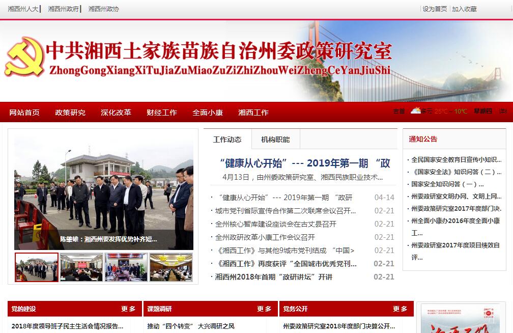 | 网站简介: 中共湘西土家族苗族自治州委政策研究室成立于1983年9月20日,2014年6月设立中共湘西自治州委全面深化改革领导小组办公室,与州委政研室一个机构、两块牌子。2019年2月机构改革,设置中共湘西土家族苗族自治州委政策研究室、中共湘西自治州委全面深化改革委员会办公室(设在中共湘西土家族苗族自治州委政策研究室)、中共湘西州委财经委员会办公室(设在中共湘西土家族苗族自治州委政策研究室),一个机构、三块牌子。内设办公室、经济科、社会科、党群科、改革调研科、改革协调科、改革督查科7个科室和《湘西工作》编辑部二级机构。 |