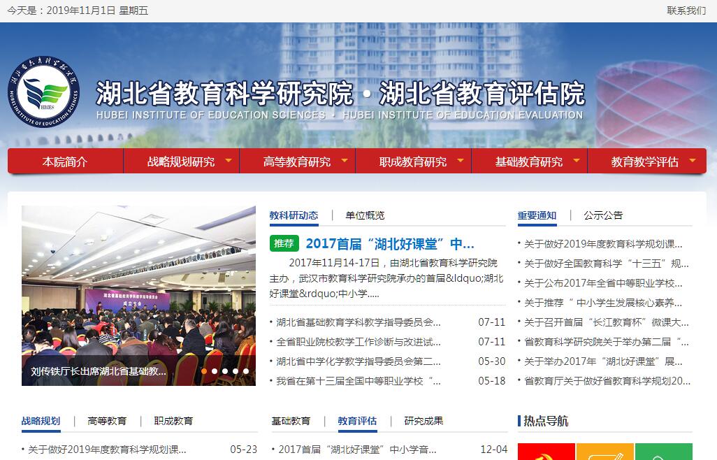 | 网站简介: 湖北省教育科学研究院、湖北省教育评估院是经湖北省机构编制委员会批准成立的省教育厅直属副厅级事业单位,实行“一个机构、两块牌子”,于2014年3月由省教育科学研究所、省职业技术教育研究中心、省教学研究室等三个机构整合组建而成。湖北省教育科学研究院、湖北省教育评估院的工作职能:承担教育规划研究、教育管理研究、教育政策研究、教育教学评估研究;承担教育教学理论与应用研究和各级各类教育科研课题,促进教育学科发展;开展教育教学实验研究,总结教育科研经验,推广教育科研成果,为各级各类学校的教育教学改革发展提供理论研究和实践指导;开展教育科研国际国内合作与交流;根据上级教育行政部门制定的政策和评估体系,具体实施各类学校教育教学评估。 |