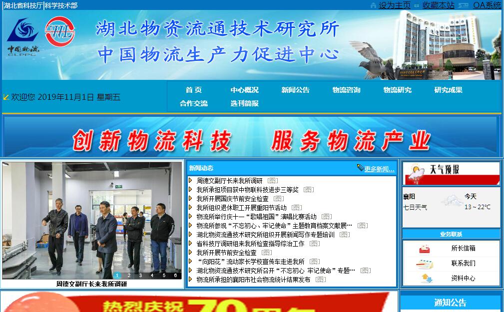 中国物流生产力促进中心(以下简称“物流促进中心”)是国家科技部于2000年批准依托湖北物资流通技术研究所(原国家物资部物流技术研究所,以下简称“物流所”)成立的国家级专业物流科技服务机构。目前物流促进中心与物流所合署办公。追溯历史,其依托机构物流所最早成立于1974年,已历40余载。当时名为襄樊市自动化研究所,主要是由一批南下中科院专家创立,第一任所长是潘云鹤先生(现任中国工程院常务副院长、院士)。1979年经国务院批准,自动化研究所划归国家物资总局管理。1983年改名为国家物资总局物资流通技术研究所。1999年国务院机构改革(部委拆并)前,曾先后隶属于原物资部、国内贸易部并分别命名为国家物资部物资流通技术研究所和国内贸易部物资流通技术研究所。国务院机构改革后由属地管理并改名为湖北物资流通技术研究所。为加强服务功能,2004年中国物流与采购联合会批准物流所(物流促进中心)建立高中初级物流师认证培训中心;2006年湖北省批准依托物流所(物流促进中心)成立湖北省物流工程技术研究中心;2009年国家标准化委员会批准将全国物流标准化技术委员会仓储技术与管理分技术委员会秘书处设在物流所(物流促进中心)。物流所(物流促进中心)还是中国物流与采购联合会的常务理事单位、中国物流技术协会副理事长单位。物流所(物流促进中心)是目前国家批准的唯一一个综合性物流技术和服务的研究机构,是一个省部共建的副厅级事业单位。物流所(物流促进中心)设有武汉、襄阳两个工作与研发基地。内设“六室二处二中心”,即标准化研究室(标委会秘书处)、信息化研究室、自动化研究室、规划与成果转化研究室、计量研究室、办公室(党委办公室)、科研管理处、财务处、物流工程技术研究中心、高中级物流师培训中心。下面主管有《物流技术》杂志社、万分衡器有限公司。物流所(物流促进中心)一直把“创新物流科技、服务现代产业”作为宗旨,面向全国开展技术研究和公益服务。先后承担国家和省部项目200多个,地方项目94个,获得国家和省部级等奖48项。直接承担了20多项国家与行业标准的研究与制定,同时组织全国相关单位制定国家与行业标准17项。大力开展物流管理与培训,培训物流人才15000名。物流所(物流促进中心)自2003年起每年举办一期“中国工业企业物流论坛暨生产制造与物流服务供需洽谈会”,搭建合作与交流平台,成效显著,已成为一个品牌活动。同时还主办了全国大学生物流模拟仿真、供应链设计等竞赛活动。物流所自1985年开始研究物流电子计量技术以来,其下属万分衡器有限公司跟进开发,目前可为社会提供大量的电子称、汽车衡和工业配套计量控制系统。物流所(物流促进中心)主管的《物流技术》杂志创刊于1981年,是我国公开发行的国家行业核心期刊,现已成为全国中文核心、科技核心、物流行业核心“三核心”期刊。物流所(物流促进中心)还组织撰写、编辑出版了书籍12本。每年为约40家行业企业提供资源与技术服务,为各级政府、行业部门和物流园区(中心)提供大量咨询和规划服务。物流所(物流促进中心)全体员工按照发展宗旨,弘扬“所之兴衰,我的责任”的责任文化,“拼搏奉献,争优创新”的创新文化, “相互协作,团结和谐”的和谐文化,奋力拼搏,为我国物流事业的发展做出了重要的贡献。