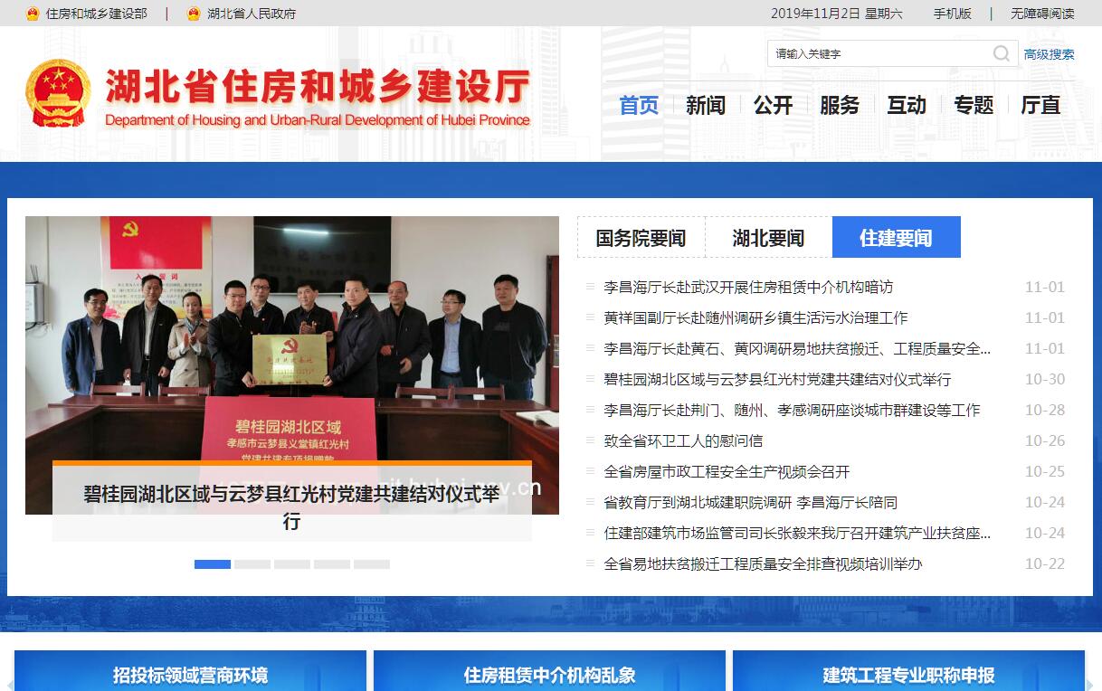 湖北省住房和城乡建设厅,为省政府组成部门。其主要职责是: 1、承担保障城镇低收入家庭住房的责任。拟订住房保障相关政策并指导实施;拟订廉租住房政策及规划,会同有关部门做好国家、省有关廉租住房资金安排,监督地方组织实施;编制住房保障发展规划和年度计划并监督实施。2、承担推进住房制度改革的责任。拟订适合省情的住房政策;指导住房建设和住房制度改革;拟订全省住房建设规划并指导实施。3、承担规范住房和城乡规划建设管理秩序的责任。提出住房和城乡建设重大问题的政策建议;拟订全省住房和城乡建设行业发展规划,起草有关住房和城乡建设地方性法规和省政府规章草案;依法组织编制和实施城乡规划,拟订城乡规划的政策和制度;组织编制全省城镇体系规划,承担省政府交办的城市总体规划和区域城镇体系规划的审查报批和监督实施工作;参与土地利用总体规划纲要的审查。4、承担规范房地产市场秩序、监督管理房地产市场的责任。会同有关部门组织拟订房地产市场监管政策并监督执行;指导城镇土地使用权有偿转让和开发利用工作;提出房地产业的行业产业政策和发展规划;制定房地产开发、房屋权属管理、房屋租赁、房屋面积管理、房地产估价与经纪管理、物业管理、房屋征收拆迁的规章制度并监督执行。5、监督管理建筑市场、规范市场各方主体行为。指导全省建筑活动;组织实施房屋建筑和市政工程项目招投标活动的监督执法;拟订勘察设计、施工、工程监理的规章并监督和指导实施;拟订勘察设计、建筑业、建设监理行业发展战略、中长期规划、改革方案、产业政策制度并监督执行;拟订规范建筑市场各方主体行为和建筑工程风险管理的规章并监督执行;组织协调勘察设计企业、建筑企业参与出省和国际工程承包、建筑劳务合作。6、组织制定工程建设实施阶段的地方标准;制定和发布地方工程建设统一定额;拟订建设项目可行性研究评价方法、经济参数、建设标准和工程造价的管理制度;拟订城镇公共服务设施(不含通信设施)建设标准并监督执行;组织实施房屋和城市市政设施的抗震设计规范;组织工程建设标准设计的审定、编制和推广;指导监督各类工程建设标准定额的实施和工程造价计价;组织发布工程造价信息。7、指导城市建设管理工作。拟订城市建设管理的政策、规划并指导实施;指导城市市政公用设施建设监督管理工作;指导城市计划用水和节约用水工作;指导城市市容环境综合整治、城建监察、城管执法和城市垃圾、污水处理工作;指导城市规划区内的绿化工作;拟订全省风景名胜区的发展规划、政策并指导实施,负责风景名胜区的审查报批和监督管理;会同有关部门组织世界自然遗产项目和世界自然与文化双重遗产项目的申报工作;会同有关部门负责历史文化名城(镇、村)的保护和监督管理。8、承担规范和指导村镇建设的责任。拟订小城镇和村庄建设政策及发展规划并指导实施;指导村镇规划编制、农村住房建设和安全及危房改造;指导小城镇和村庄人居环境的改善工作;指导重点镇建设和村镇建设试点工作。9、承担建设行业稽查责任。对城乡建设领域违法违规问题实施稽查,提出改进和处理意见;对城市总体规划、历史文化名城保护规划、区域城镇体系规划及风景名胜区规划实施监督检查。10、承担建筑工程质量安全监管的责任。拟订建筑工程质量、建筑安全生产和竣工验收备案的政策、制度并监督执行;组织或参与工程重大质量、安全事故的调查处理;拟订建筑业、工程勘察设计咨询业技术政策并指导实施。11、承担推进建筑节能、城镇减排的责任。拟订住房和城乡建设科技发展规划和经济政策;会同有关部门拟订建筑节能的政策、规划并监督实施;组织实施重大建筑节能项目,推进城镇减排;组织实施重点建设科技项目的研究开发。12、承担推进墙体材料革新和发展散装水泥的职责。拟订发展应用新型墙体材料和发展散装水泥的政策、制度和规划并指导实施;负责新型墙体材料的推广应用;会同有关部门拟订新型墙体材料专项基金和散装水泥专项基金政策并组织实施。13、负责住房公积金监督管理,确保公积金的有效使用。会同有关部门拟订住房公积金政策、发展规划并组织实施;制定住房公积金缴存、使用、管理和监督制度,监督全省住房公积金和其他住房资金的管理、使用;管理住房公积金信息系统。14、开展住房和城乡建设方面的国际交流合作。15、承担省住房制度改革领导小组、省建筑节能与墙体材料革新领导小组的日常工作。16、承办上级交办的其他事项。