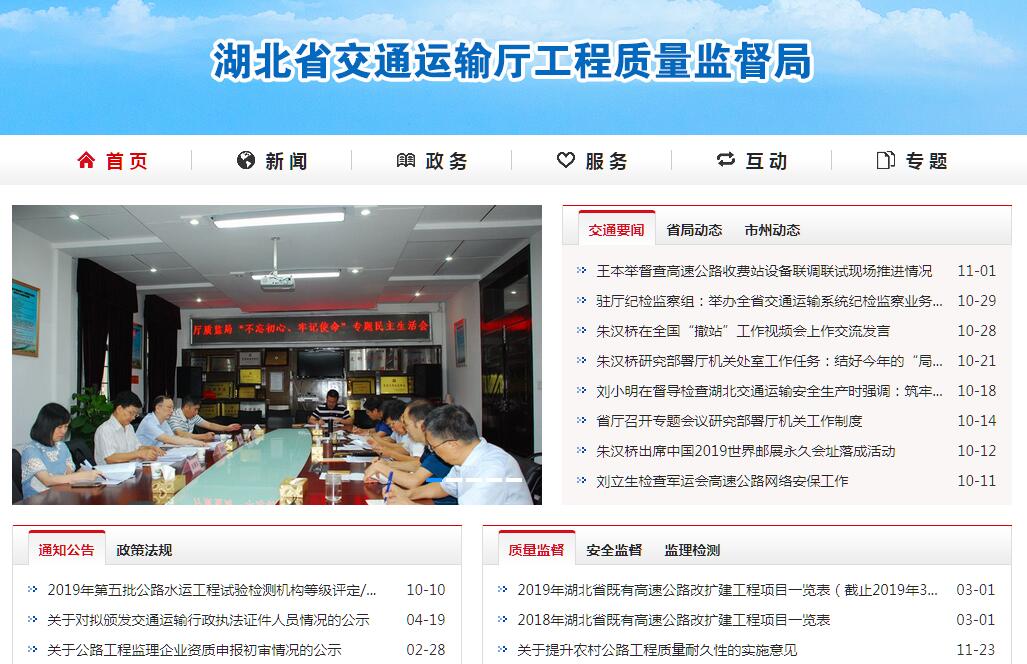 湖北省交通运输厅工程质量监督局主要职责:一、贯彻执行国家和省有关工程质量工作的法律、法规和方针、政策;拟订全省公路、水运工程质量监督、工程监理和试验检测等方面的规章制度、管理办法和实施细则等,并监督执行。二、负责全省公路、水运工程质量监督管理工作,具体负责公路、水运工程质量监督、工程监理和试验检测管理。三、参与全省公路、水运工程建设市场管理,具体负责公路、水运工程监理、试验检测市场管理;对重点工程建设项目的工程质量、施工安全、监理及试验检测工作进行直接监督、检查,对市州交通工程质量监督工作进行检查、指导;组织重点工程交、竣工质量鉴定,签发《公路、水运工程质量鉴定书》;参与工程交、竣工验收和行业工程质量检查。四、受省交通厅委托,对市州交通工程质量监督机构资质进行管理,组织对市州交通工程质量监督机构的资质进行考核、复查。五、受省交通厅委托,承担公路、水运工程监理单位、监理工程师的资质审核、申报、执业登记、年检等工作。六、受省交通厅委托,承担公路水运工程质量检测机构和人员的资质审查、考核、发证工作;参与对试验检测机构的计量认证工作。七、负责对公路、水运工程质量监督人员、监理人员和试验检测人员的业务培训管理工作。八、受理对工程质量的控告、举报,参与工程质量事故的调查、处理,仲裁工程质量争端,对玩忽职守,造成工程质量严重事故的监督、监理单位和个人及施工单位的直接责任人,提出处罚意见和建议。九、参与厅优秀勘察、设计优质工程的评审工作,以及部、省“三优”工程的申报工作。十、负责本站精神文明、党风廉政建设和行政监察工作。十一、完成上级交办的其他事项。