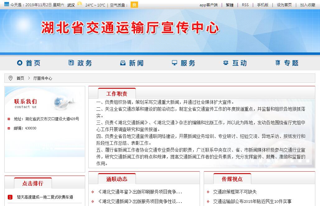 | 网站简介: 湖北省交通运输厅宣传中心主要职责:一、负责组织协调,策划采写交通重大新闻,并通过社会媒体扩大宣传。二、关注全省交通改革和建设的前沿动态,制定全省交通宣传工作的年度报道重点,并监督和组织各地狠抓落实。三、负责《湖北交通新闻》、《湖北交通》杂志的编辑和出版工作,并以此为阵地,发动各地围绕省厅党组中心工作开展调查研究和宣传报道。四、负责全省各地交通宣传通联网络建设,开展新闻业务培训、专业研讨、经验交流、异地采访、报纸发行和阶段性工作总结、表彰工作。五、履行省新闻工作者协会交通专业委员会的职责,广泛联系中央在汉、省、市新闻媒体积极参与交通行业宣传,研究交通新闻工作的特点和规律,提高交通新闻工作者的业务素质,充分发挥宣传、鼓舞、激励和监督的作用。 |