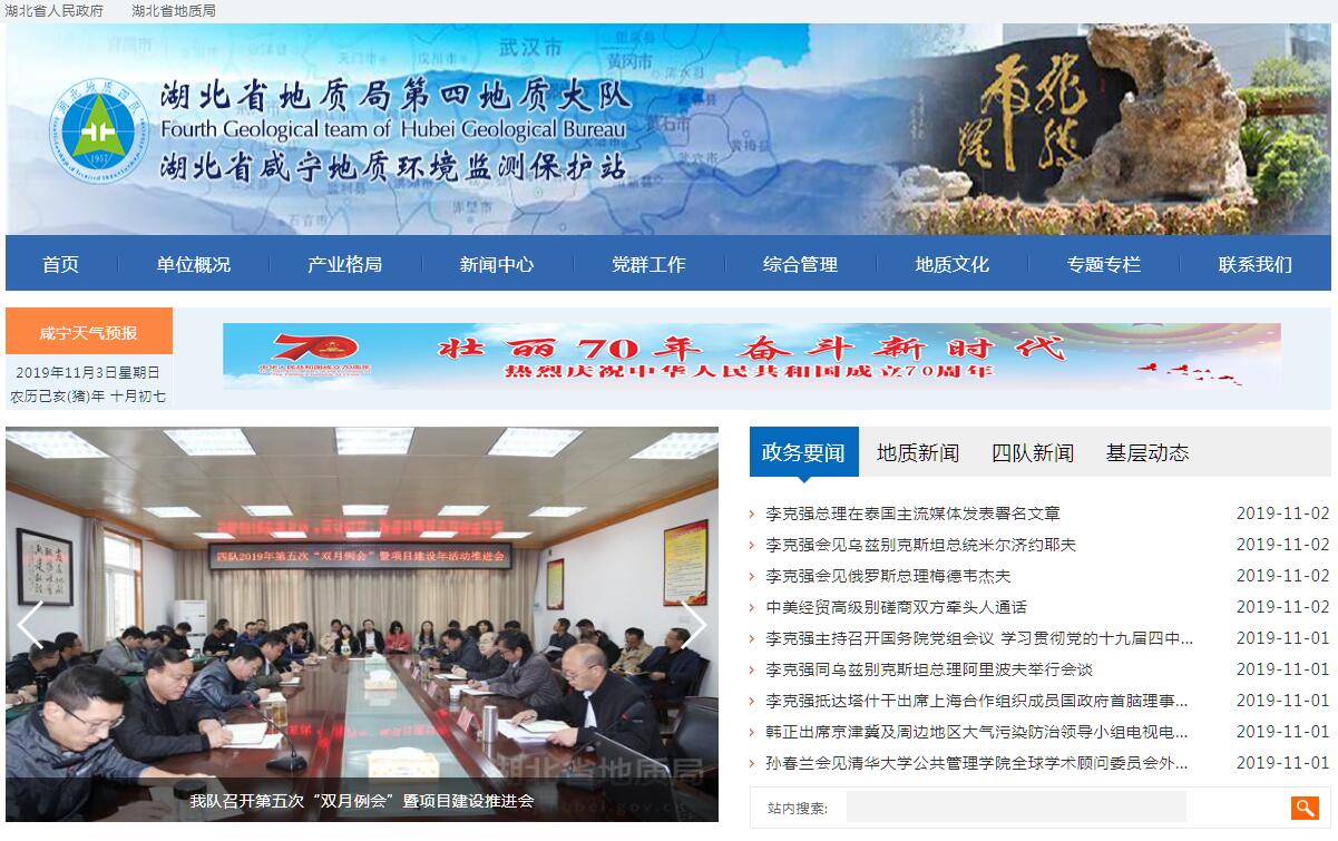 湖北省地质局第四地质大队(湖北省咸宁地质环境监测保护站),隶属于湖北省地质局,座落于享有“香城泉都”美誉的咸宁市,是省地质局所属驻咸宁市唯一综合性地质矿产勘查和地质环境监测保护事业单位。我队创建于1957年,1974年由原湖北省第四地质队(前身为原湖北省地质局801队),与原湖北省第五地质大队(前身为原地矿部701队)合并组成,更名为“湖北省第四地质大队”;1982年,更名为“湖北省第四探矿工程大队”;1986年,更名为“湖北省第四地质大队”,1999年,由原国土资源部移交湖北省政府直管。2014年8月,经省编办批复同意,在局属事业单位分类改革中,我队更名为“湖北省地质局第四地质大队”,加挂“湖北省咸宁地质环境监测保护站”牌子,属公益二类事业单位。此次更名调整后,我队事业职能从以地质矿产资源勘查为主转向地质矿产资源勘查与地质环境监测保护并重,主要承担国家和省下达的基础性、公益性和战略性地质调查和矿产勘查任务,以及咸宁市基础性、公益性地质环境监测与保护任务,同时依托技术优势,积极向社会提供地矿勘查、岩心钻探、实验测试、矿政服务、工程勘察、国土测绘、管线探测、地基处理等相关技术性服务。我队现有在职职工547人,其中各类专业技术人员294人。六十多年来,我队在咸宁市及黄石大冶市、阳新县、武汉江夏区、鄂州市等地开展找矿工作,共发现和探明各类矿产资源59个矿种、69个亚矿种,已探明资源储量的矿产44种,列入省级储量表的有18种。其中,储量居全省前五位的达11种,钽、铌、稀土砂矿、锑、钾长石、纳长石、白云母、镁白云岩和地热等9种矿产居全省同类矿产资源储量之首;岩金、铌矿、冶金白云岩、钒矿、锰矿和煤矿等6种矿产的资源量居全省矿产资源量的第2~4位;我队发现并探明的嘉鱼蛇屋山金矿床,是我国首例、亚洲地区最大的“红土型”金矿床。同时,我队充分发挥专业技术优势,拓展地质工作领域,开展地下找水勘查和工民建工程勘察与基础施工,参与咸宁农业地质和旅游地质调查,参与湖北、湖南两省的核电站选址勘查,参与三峡库区与咸宁市地质灾害评估、勘查、设计、施工,承担鄂南地区矿山地质环境恢复治理和地质灾害应急治理工作,开展无人机航空摄影测量、地下管线探测、工程物探、实验分析与测试等工作。我队坚持开展文明单位创建工作,大力弘扬社会主义核心价值观,弘扬地质“三光荣”、“四特别”、“两干净”精神和“朴实、专业、责任、创新、包容、奉献”的四队精神理念,不断加强基础管理,促进队伍建设,打造花园式基地,积极推进地矿文化建设系统化开展,单位形象和职工队伍精神面貌焕然一新。我队先后获得湖北省五一劳动奖状、全国厂务公开民主管理先进单位、原地矿部找矿一等奖、原地矿部成果报告二等奖、全国矿产资源利用现状调查工作优秀成果奖、湖北省“找矿先进单位”、湖北省科学技术进步二等奖、湖北省安全生产先进单位、档案工作先进集体、综合治理先进单位、“湖北省工人先锋号”、湖北省模范职工之家、湖北省卫生先进单位、咸宁市园林式居住区等荣誉。进入“十三五”以来,我队全面贯彻党的十九大精神,以习近平新时代中国特色社会主义思想为指导,深入贯彻落实省委、省政府决策部署和局“一转五化”发展战略和“六项重点工程”以及“一个率先、五个明显提高”的要求,始终坚持“一根主线”(以科学发展、转型发展、创新发展为主线)、“三个抓手”(以“项目建设、能力建设、党建和党风廉政建设”为抓手)的原则,努力构建“两个事业、四个产业”(地质勘查事业、地质环境事业、矿产开发产业、地质工程产业、地质技术服务产业、社区服务产业)发展格局,加快恢复和发展,不断开创各项工作新局面。