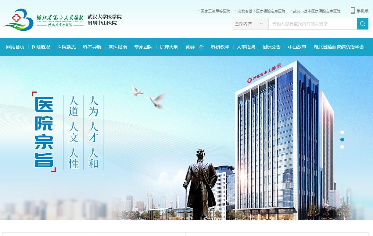 湖北省第三人民医院(湖北省中山医院)始建于1951年,原名武汉军工总医院。2002年6月,由军队管理移交至湖北省卫生厅,更名为湖北省中山医院。2014年12月,省卫生计生委批准医院第一名称变更为湖北省第三人民医院。医院是政府主办的全民非营利性医疗机构,同属“武汉大学医学院附属中山医院”,是一所集医疗、科研、教学、预防、康复为一体的综合性大型三级甲等医院,是医保和商业保险定点医院、湖北省康复救助项目定点机构、国家爱婴医院。2004年9月,伟大的革命先行者孙中山先生的孙女,檀香山中国妇女慈善会会长孙穗芳博士受聘担任医院名誉院长。医院设有硚口和阳逻两个院区,编制床位1800张,职工1900余人,是“湖北省基层卫生指导与培训中心”、“湖北省脑卒中诊疗中心”、“湖北省脑卒中筛查与防治领导小组办公室”、“湖北省疼痛医疗质量控制中心”挂靠单位,湖北省互联网医院。同时也是首批“国家住院医师规范化培训基地”、国家三级甲等医院,是“国家药品临床试验(GCP)基地”、“国家级高级卒中中心”、“卫生部脑卒中筛查与防控基地”、“全国肝胆病防治技术示范基地”、“国家级皮肤医疗美容示范基地”、“全国健康管理示范基地”、“湖北省脑卒中筛查与防治基地”、“湖北省疼痛治疗中心”、“武汉市脑瘫儿童康复技术指导中心”,湖北省疼痛学会主任委员单位,湖北省肝胆疾病学会中西医结合肝胆病专委会主任委员单位,湖北省残疾人康复协会肢体残疾康复委员会脑瘫康复组主任委员单位。神经内科、疼痛科、医学美容科和超声影像科是湖北省临床重点专科。
