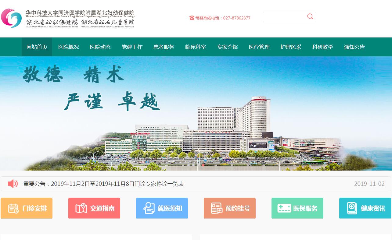 湖北省妇幼保健院(湖北省妇女儿童医院)成立于1977年,为湖北省卫生健康委直属的三级甲等妇幼保健院,华中科技大学同济医学院附属医院,原国家卫生部、世界卫生组织、联合国儿童基金会首批授予的“爱婴医院”、“全国十佳模范爱婴医院”,湖北省首家生殖保健中心。医院承担湖北省妇女儿童医疗、保健、生殖健康技术指导、健康教育、妇幼卫生信息管理、科研教学等六大任务,为湖北省妇幼保健业务指导中心。全院占地面积300余亩,现有业务用房面积15.8万平方米,分为街道口本部、光谷分院、洪山院区、徐东门诊部、丁字桥特殊儿童训练中心5部分。编制床位1900张,开放床位1400张。医院现有职工2500余人,卫生技术人员2300余人,副高以上职称300余人,硕博士639人,8名专家享受国务院津贴,200余名专家分别担任各级各类学术团体理事以上职务。2018年门诊人次254万,出院患者8.6万,分娩量2.7万。医院设一级临床科室30个,医技科室6个,保健科室4个,二级专科近60个。设有湖北省产前诊断中心、湖北省出生缺陷精准医学中心、湖北省宫颈癌防治中心、湖北省遗传医学中心、湖北省新生儿疾病筛查中心、湖北省新生儿急救转运中心、湖北省危重孕产妇救治中心、湖北省新生儿急救医学临床研究中心、湖北省新生儿专业医疗质量控制中心、湖北省儿童发育行为中心等多个中心。医院高度重视学科建设。中医妇科为国家中医药管理局重点专科培育建设单位,产科、妇科、新生儿科、儿科、生殖医学、超声诊断科、儿童保健科、小儿外科为省级重点专科。妇产科、儿科、临床病理、小儿外科为国家级住院医师规范化培训基地。产科为国家级助产士规范化培训基地、国家级孕产期保健特色专科,妇科为全国妇科内镜诊疗技术培训基地、宫颈病变防治基层进修培训基地,新生儿科为全国新生儿专业医师培训基地,超声诊断科为国家级产前诊断超声骨干与师资培训基地、全国出生缺陷防治人才培训基地,儿童保健科为国家级儿童早期发展示范基地。医院高度重视技术提升。产科开展凶险性前置胎盘腹主动脉球囊扩张止血手术。产科、妇科、妇科II、成人ICU、外科、超声诊断科、医学影像科等科室开展MDT合作,成功抢救多器官功能衰竭、结肠癌晚期、孕晚期车祸等高危孕产妇。妇科为全国四级内镜技术培训基地,微创手术达95%以上,四级手术约占40%。新生儿科成功开展持续血液净化技术、化学疗法治疗新生儿血管内皮瘤、新生儿脑血管造影术、新生儿脑静脉窦血栓的溶栓治疗。儿童呼吸科在全省首家开展床边纤支镜技术、且唯一开展儿童呼吸内镜四级技术。超声诊断科开展弹性成像评价宫颈成熟度、5D-Heart胎儿心脏超声检查等多项新技术、新业务。多学科协作的产前诊断模式为省内首创,年确诊畸形儿近万例,保障了出生人口素质。孤独症儿童评估及训练方法、发育障碍儿童综合训练方法在国内保持领先地位。面向未来,医院将按照现代医院管理要求,进一步加强党的建设、进一步深化改革创新、进一步加大基本建设力度,进一步重视人才培养,进一步加强专科建设,进一步开展对外交流与合作,力争建设成服务功能完善、服务理念先进、医疗技术领先、政府百姓满意,国内一流、世界知名的省级妇幼保健院。