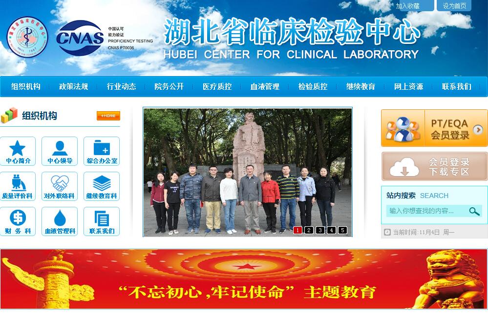 湖北省临床检验中心(以下简称中心)座落于武汉市内环线丁字桥路100号。于1985年1月开始筹建,1987年8月13日经湖北省机构编制工作委员会批准正式成立。中心是直属湖北省卫生健康委员会领导的正处级单位,并挂“湖北省医疗质量控制中心管理办公室”、“湖北省临床检验质量控制中心”和“湖北省血液质量管理和控制中心”三块牌子。中心自成立以来,先后经历了5年挂靠创建、8年独立创业、7年求实创新和12年科学创行四个发展阶段。三十年来,中心薪火相传,各项工作取得了长足进步。目前中心内设6个职能科室:综合办公室、财务科、质量评价科、对外联络科、继续教育科、血液质量管理科。三级正高职称1人、四级正高职称4人、副高职称2人、中级职称4人和初级职称4人,硕士研究生6人、大学本科9人和大专3人。中心主要工作职能:1、负责全省临床检验质量管理与控制;组织开展全省医疗机构临床实验室室间质量评价、室内质控数据实验室间比对等质控工作实施;2、负责全省临床检验业务质量管理和技术指导;3、负责制定全省临床检验专业和管理人员继续教育工作计划,组织学术信息交流;4、开展临床检验理论和方法学研究,推广新技术,从事特殊检验人员上岗培训;5、负责管理全省临床检验质量与信息管理计算机网络;6、负责对全省采供血机构的血液质量进行抽样检测;7、对全省采供血机构和医疗机构输血检验质量评价,对全省采供血机构和医疗机构临床用血工作实施监督管理、质量控制、人员培训和业务指导工作;8、承担省卫生行政部门交办的其他任务。湖北省医疗质量控制中心管理办公室:负责各省级质控中心的日常管理和业务指导,加强与省级各专业医疗质量控制中心的日常沟通与协调,做好各专业医疗质量控制中心季度和年度质控信息汇总分析、上报工作,按季度编印医疗质量控制工作简报,对省级医疗质量控制中心进行评价和考核等工作。湖北省临床检验质量控制中心:负责全省临床检验质量管理、业务技术指导、检验医学研究和继续医学教育等工作。湖北省血液质量管理和控制中心:负责对全省采供血机构和医疗机构输血检验质量评价,负责对全省采供血机构和医疗机构临床用血工作实施监督管理、质量控制、人员培训和业务指导工作。中心遵循“公正、科学、有效”的原则,秉承“三个服务”(服务于全省各市州临床检验中心、服务于全省各临床实验室、服务于临床检验相关企业),建立健全“三个体系”(临床检验质控体系、临床检验法规体系、临床检验评价体系),切实加强“三项管理”(临床检验质量管理、临床检验信息管理、临床检验生物安全管理),坚持“三项学习”(以党委理论学习中心组为抓手,坚持政治理论学习,加强党风廉政建设;以专题讲座和培训班为载体,坚持业务知识学习,打实基础,提升服务水平;以行政办公会为平台,坚持行政管理学习,发现问题,提高能力素质)。2014年9月19日,中心根据《能力验证计划提供者能力的要求》ISO/IEC17043:2010(《能力验证计划提供者认可准则》CNAS-CL03)的要求,通过了中国合格评定国家认可委员会认可(注册号:CNAS PT0036),成为全国继卫生部临床检验中心、上海市临床检验中心第三家获得认可的医学检验领域能力验证提供者。 2014年11月24日,中心当选为中国医院协会临床检验管理专业委员会第四届副主任委员单位。近年来,根据《能力验证计划提供者能力的要求》ISO/IEC17043:2010,结合我省实际情况,建立质量管理体系,临床检验能力验证活动已覆盖全省各级各类机构临床实验室500余家,开展临床化学专业等23个计划100多个项目的能力验证。通过实施临床检验信息公示、临床实验室(重点)专科评审、医院管理综合评审、同级医疗机构临床检验结果互认等活动,有力促进了全省临床检验事业又好又快的发展。