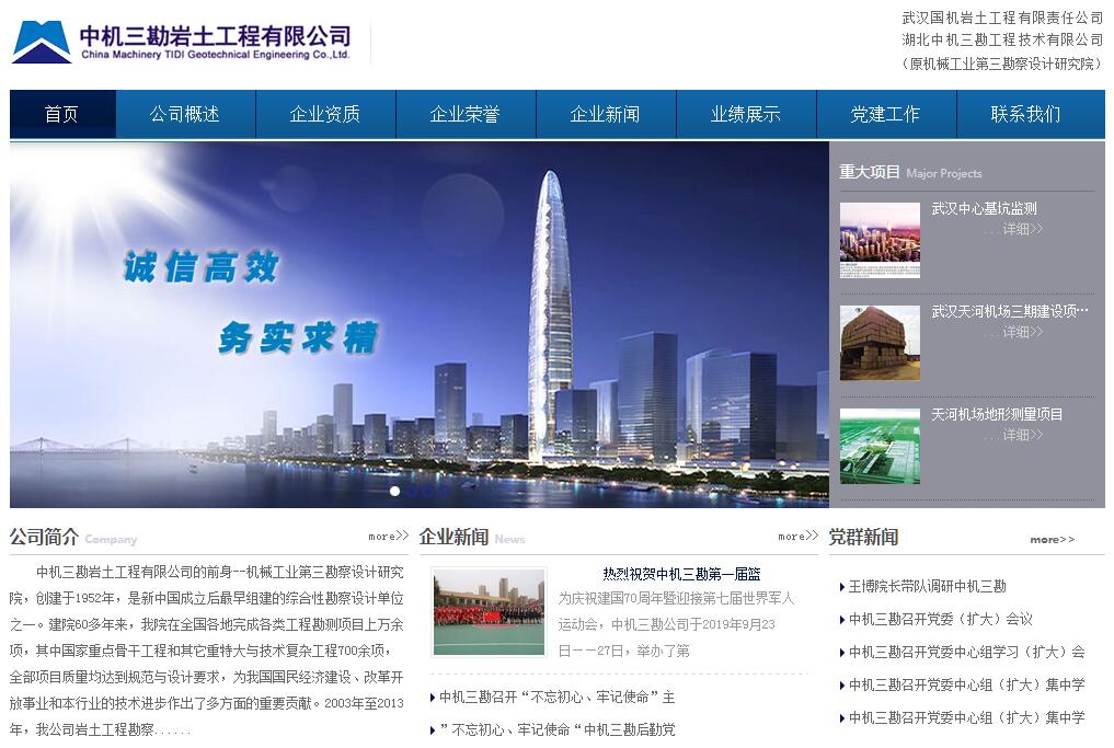 中机三勘岩土工程有限公司(原机械工业第三勘察设计研究院),创建于1952年,是新中国成立后最早组建的综合性勘察设计单位之一,曾由机械工业部领导,现隶属于中国农业机械化科学研究院(集团)、中国机械工业集团有限公司。公司曾被建设部授予“全国工程勘察先进单位”、被湖北省建设厅授予“勘察设计业百强单位”、被武汉市建委授予“岩土工程施工先进企业”称号。我公司现为中国岩土工程研究中心副主任单位、中国机械工业勘察设计协会常务理事单位、湖北省勘察设计协会甲级会员单位、武汉市勘察设计协会常务理事单位和湖北省测绘行业协会理事单位等,是国防机械工业科技情报网的创始成员和相关技术交流文献与期刊的轮值主编单位之一。公司持有建设部核发的工程勘察综合类甲级证书,国家测绘局核发的甲级测绘证书,中国机械工业联合会核发的乙级工程监理证书等。依托公司在勘察及岩土工程领域的技术优势,1996年成立了中机三勘岩土工程有限公司的全资子公司“武汉国机岩土工程有限责任公司”,并于当年持有建设部核发的地基与基础施工壹级企业资质证书。中机三勘岩土工程有限公司全资子公司“湖北中机三勘工程技术有限公司”具有地基基础检测等相关项目的资质证书。我公司通过质量、职业健康安全、环境三合一管理体系的认证和计量认证。公司设有岩土工程勘察,岩土工程施工、深基坑支护设计施工、工程测量与大地测绘,建筑工程全寿命监控与监测,水文地质勘察,应用地球物理勘探,岩土(水)试验,凿井与降水设计与施工,工程咨询,工程监理,地质钻探及原位测试设备修造与技术研发等生产与研究部门。现有高级工程师以上职称40人,各类专业技术及注册人员占全公司总人数的90%,享受政府特殊津贴的专家8人,被认定为有突出贡献的中青年专家5人;我国工程勘察界最高学术与荣誉称号——勘察大师的获得者中,有7人曾先后在我公司工作过或在我公司工作期间获得此项殊荣。公司历来重视人才培养和科技创新。近年来,每年均有计划地从各高等院校择优录用相应专业的学士、硕士与博士,充实到各专业生产及技术研发部门,并陆续引进了一些具有更高知识结构层次与实践经验的工程技术及经济管理人才,担任重要专业、部门和新兴领域的带头人,从而进一步提高了我公司的整体技术、管理水平与综合竞争实力。公司创建60多年来,在全国完成各类工程勘测项目上万余项,其中国家重点骨干工程和其它重特大与技术复杂工程800余项、完成地基基础施工、工程检测等项目3000余项,全部项目质量均达到规范与设计要求,为我国国民经济建设、改革开放事业和本行业的技术进步作出了多方面的重要贡献。公司承担并完成的第二汽车制造厂及武汉神龙汽车公司、南京汽车制造厂、上海闵行和哈尔滨动力设备制造基地、齐齐哈尔重型机床厂、南京炼油厂五万吨级油罐区、上海机电大厦、上海彭浦新村、三江航天基地及其内迁、上海惠普电子产业园、中联(博世)汽车电子工业公司、安徽安庆碧桂园、湖北随州碧桂园、武汉体育中心、武汉轻轨地铁勘察、天河机场勘察、东风雷诺15万辆一期建设项目地基处理工程以及伊拉克华事德(WASIT)4×330MW亚临界燃油(气)机组工程桩一期、二期项目、越南海防II期2×330MW火电项目工程3#标段桩基工程、印尼巴厘岛一期3×142MW燃煤电厂项目PC/PHC桩基施工工程项目、伊拉克苏维拉污水处理厂及泵站管网工程岩土工程勘察项目、伊拉克希拉市污水处理厂岩土工程勘察项目、赤道几内亚马拉博大学城岩土工程勘察项目、印尼宏发韦立氧化铝公司印尼热电厂桩基项目、新疆中泰化学阜康能源有限公司2x150MW自备热电联产项目钻孔灌注桩工程以及健鼎(湖北)电子有限公司主厂房及生活设施整体桩基项目等工业与民用建筑项目的选址、实施和竣工阶段的工程测绘、地质勘察、工程监测与竣工测量的工程活动或技术研究,相继获得了省、部级以上的优秀勘察与测量成果奖或科技进步奖。近年来,公司岩土工程勘察、设计、测量业务的总产值和市场占有率,一直居武汉市前列。现今武汉市最高的建筑物——民生银行大厦(地上68层)、在建的武汉中心(地上88层,高428米,地下4层,深25米)的岩土工程勘察与工程监测、在建的武汉市周大福金融中心(一栋648米主塔楼,4栋83-90层超高层辅楼及一个4层地下室)以及“武汉绿地国际金融城暨绿地中心”(投资约300亿,高606米,武汉市规模最大的现代服务业综合体)的岩土工程勘察均由我公司承担完成,表明我公司在高层建筑勘察处于武汉乃至中南地区的先进水平。