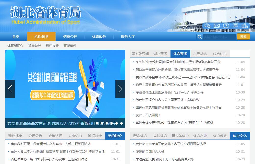 湖北省体育局是省政府主管全省体育工作的直属机构。主要职责包括:贯彻执行国家和省有关体育工作的方针政策、法律法规;研究全省体育发展战略,负责推动多元化体育服务体系建设,推进体育公共服务;拟订并组织实施全省体育事业发展规划和政策,起草有关地方性法规、省政府规章草案;统筹规划全省群众体育发展,负责推行全民健身计划,监督实施国家体育锻炼标准,推动全省国民体质监测和社会体育指导工作队伍制度建设,指导公共体育设施的建设,负责对公共体育设施的监督管理;统筹规划全省竞技体育发展,研究和平衡体育运动项目设置,指导协调体育训练和体育竞赛,指导全省运动队伍建设,协调运动员社会保障工作;统筹规划全省青少年体育发展,指导和推进青少年体育工作;拟订全省体育产业发展规划、政策,规范体育服务管理,推动体育标准化建设,负责全省体育彩票销售的监督管理;负责全省举办的国际国内重大比赛的指导、组织协调,指导参加国家级以上综合运动会的组织管理及统筹安排,指导、协调、监督全省性的体育竞赛工作;指导、管理全省体育外事有关工作,组织开展我省与外国及港澳台的体育交流与合作;组织开展体育领域重大科学研究、技术攻关和成果推广;负责组织协调、监督全省体育运动中的反兴奋剂工作;承办上级交办的其他事项。
