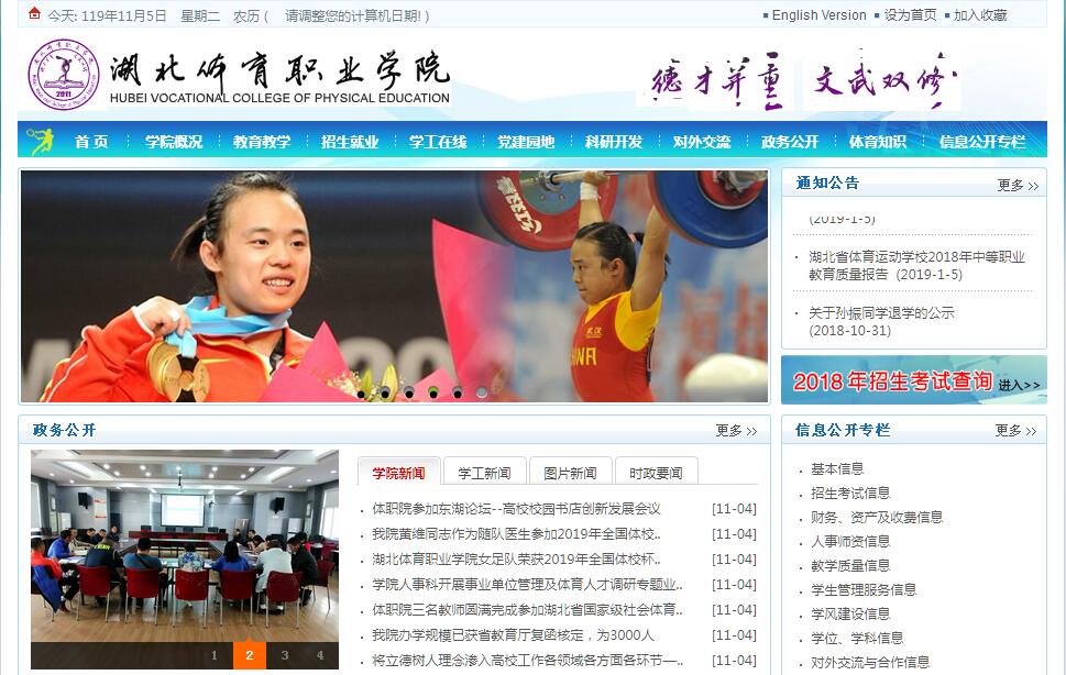 湖北体育职业学院,前身为1978年创建的湖北省体育运动学校,2010年7月经湖北省政府批准,2011年5月国家教育部备案,升格为高职院校,隶属于湖北省体育局。学院位于武汉市东湖新技术开发区高新大道333号,风景秀丽,环境优美,是一所集体育职业教育、运动训练、体育科研于一体的全日制公办体育高等职业学院。学院占地546亩,建筑面积12万平方米。建有文化教学大楼、篮球馆、排球馆、武术馆、综合训练馆(散打、乒乓球、羽毛球)、200米塑胶田径馆、400米塑胶田径场、足球场、网球场、室外篮球场、重竞技馆(举重、摔跤、柔道、拳击、跆拳道、击剑)、射击馆、体育舞蹈实习实训基地、运动防护实习实训基地、高尔夫实习实训基地、行政办公楼、学生宿舍以及进餐、洗浴、医疗、交通、通讯等设施设备。学院对外保留“湖北省体育学校”牌子,院领导设党委书记、院长各一名,副院长两名,纪委书记一名。师资队伍分为文化基础课教师、体育基础理论课教师、术科教师(教练员)三类,配备科学合理。学院有专任教师85人,其中具有副高级以上专业技术职务的17人,占20%;大学本科以上学历教师49人,占58%;研究生学历25人,占29%;外聘10人,占12% 。学院严格坚持党的教育、体育方针和法律、政策,遵循高等职业教育、竞技体育和体育后备人才发展规律办学,分为高职和中职教育两部分。学院高职教育,以培养高水平实用技能型体育职业人才为方向,为湖北建设体育强省造就具有良好体育职业素质、体育理论知识和体育专业技能的各类体育职业人才。学制三年,开设有运动训练、社会体育、体育运营与管理、体育保健与康复、健身服务与管理等五个专业,其中社会体育和体育运营与管理是国家财政重点支持专业。学院课程设置科学前瞻,注重培养学生的实践能力、动手能力。自开办以来,先后在全国体育职业学院教师基本功比赛中获得两个二等奖;在全国高等体育职业院校学生职业技能大赛荣获体育营销项目团体一等奖、户外运动项目团体三等奖;在全省高等院校田径运动会上获团体总分第一,打破记录10项;在全省体育科学论文大会上,获一等奖一项,二等奖二项;参编了国家体育总局“十三五”职业教育规划教材《体育服务概论》、《运动防护》和《健身体能锻炼与评定》等教材;主持和参与国家级项目一项、省部级项目五项;累计发表论文200余篇。学院中职教育,附设中专部——湖北省体育运动学校,学制三至六年,主要以培养高水平体育后备人才为宗旨,是国家重点高水平体育后备人才基地、湖北省少儿体育训练的最高层次。学院坚持读训并重,每天上午进行文化学习,下午从事运动训练。在校学生约700人,运动项目设有篮球、排球、足球、田径、乒乓球、羽毛球、网球、击剑、武术(含套路和散手)、举重、拳击、摔跤、射击、柔道、跆拳道和体育舞蹈等16个专业,建有女足、举重、射击三个单项学校,列为全国青少年足球菁英人才培养计划试点单位。文化课程设置与全日制普通中学课程设置同步。自建校以来,培养输送了高崚、廖辉、吕小军等奥运冠军,胡小新、蔡军、关虹、刘黎敏、韩晶娜、王晓理、汤洁丽、许晴、田源、田涛等世界冠军,以及阎峰、张勇军、胡蓉、邓爱民、许晴、蔡晟、阎毅等体坛名将,成为湖北省优秀体育后备人才的摇篮。创造了自24届奥运会连续八届有学校输送运动员参赛的辉煌。荣获“第十三届全运会备战参赛先进单位”。学院地缘优势突出,地处“武汉·中国光谷”黄金地段,周边大学、高档住宅区林立,武汉市三环线、雄楚大道高架、地铁十一号线等环绕,交通便利,发展潜力巨大。目前学院在省体育局的领导下,正积极抢抓机遇,坚持高质量高标准建设思路,积极推进学院硬件设施提档升级,向着省内一流、国内知名的体育技能实用型高职院校奋进。