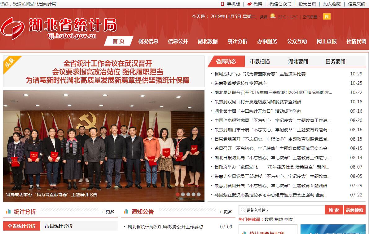 湖北省统计局主要职责:一、承担组织领导和协调全省统计工作,确保统计数据真实、准确、及时的责任。按照国家法律、法规和规划,制定全省统计政策、规划、基本统计制度和统计标准,拟订有关地方统计法规、省政府规章草案,指导全省统计工作。二、按照国家国民经济核算体系和核算制度,组织实施全省国民经济核算体系和投入产出调查,核算全省及市(州)、直管市、神农架林区国内生产总值,汇编提供全省国民经济核算资料,监督管理各地区国民经济核算工作。三、会同有关部门组织实施全省人口、经济、农业等重大国情国力普查,汇总、整理和提供全省有关国情国力方面的统计数据。四、组织实施全省农林牧渔业、工业、建筑业、批发和零售业、住宿和餐饮业、房地产业、租赁和商务服务业、居民服务和其他服务业、文化体育和娱乐业以及装卸搬运和其他运输服务业、仓储业、计算机服务业、软件业、科技交流和推广服务业、社会福利业等统计调查,收集、汇总、整理和提供有关调查的统计数据,综合整理和提供地质勘查、旅游、交通运输、邮政、教育、卫生、社会保障、公用事业等基本统计数据。五、组织实施全省能源、投资、消费、价格、收入、科技、人口、劳动力、社会发展基本情况、环境基本状况等统计调查,收集、汇总、整理和提供有关调查的统计数据,综合整理和提供资源、房屋、对外贸易、对外经济等全省性基本统计数据。六、组织各地区、各部门及武汉城市圈"两型社会"综合配套改革试验区、鄂西生态文化旅游圈的经济、社会、科技和资源环境统计调查,统一核定、管理、公布全省性基本统计资料,定期发布全省国民经济和社会发展情况的统计信息,组织建立服务业统计信息共享制度和发布制度。七、对全省国民经济、社会发展、科技进步和资源环境等情况进行统计分析、统计预测和统计监督,向省委、省政府及有关部门提供统计信息和咨询建议。八、审批省内部门统计标准,依法审批或者备案各部门统计调查项目、地方统计调查项目,指导专业统计基础工作、统计基层业务基础建设,建立健全全省统计数据质量审核、监控和评估制度,开展对重要统计数据的审核、监控和评估,依法监督管理全省涉外调查活动。九、管理省属地方调查队,协助地方管理市、州、直管市、神农架林区统计局局长和副局长,指导全省统计专业技术队伍建设,会同有关部门组织管理全省统计专业资格考试、职务评聘和从业资格认定工作,监督管理地方政府统计部门由中央或省财政提供的统计经费和专项基本建设投资。十、建立并管理全省统计信息自动化系统和统计数据库系统,建立和维护全省基本单位名录库,贯彻执行国家制定的各地区、各部门统计数据库和网络的基本标准和运行规则,指导地方统计信息化系统建设。十一、收集、整理国际及省际统计数据,组织实施国际及省际间统计资料交换和统计交流合作项目。组织开展统计科学研究和指导统计学会工作,组织管理和指导社情民意调查工作。十二、为大企业提供"直通车"服务。十三、承办上级交办的其他事项。