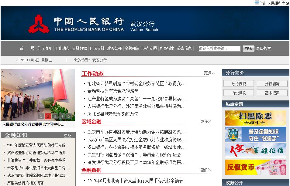 中国人民银行武汉分行于1998年12月12日正式挂牌。作为中国人民银行总行的派出机构, 在总行的直接领导下,负责在江西省、湖北省、湖南省三省的范围内履行中央银行职能。目前,分行下设1个营业管理部、2个省会城市中心支行、35个 市(州)中心支行、222个县(市)支行。其主要职责是:(一)认真贯彻执行国家有关法律、法规、方针、政策及总行的有关政策规定。(二)负责在辖区内贯彻执行中央银行资金、存款准备金、再贴现、利率等有关货币信贷政策,监督管理金融市场。(三)防范化解辖区及所在省(区、市)系统性金融风险,维护地区金融稳定。(四)分析、研究辖区及所在省(区、市)宏观经济金融形势,为总行的货币政策决策提供政策建议和依据。(五)负责管理所在省(区、市)金融统计工作及信贷征信业务,推动建立社会信用体系。(六)管理所在省(区、市)货币发行、现金管理和反假人民币业务。(七)管理所在省(区、市)人民银行系统的会计财务、支付结算业务,负责对大额资金异常流动的监测。(八)管理所在省(区、市)外汇、外债和国际收支业务。(九)管理所在省(区、市)国库业务、科技和安全保卫工作。(十)依管理权限负责辖区人事、内审、党群等工作。(十一)承办总(分)行交办的其他事项。