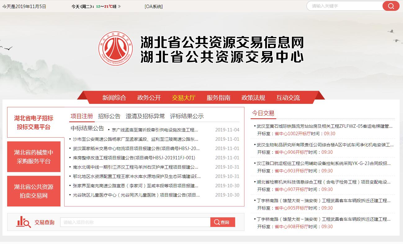 湖北省公共资源交易中心前身为“湖北省综合招投标中心”,成立于2003年,坐落于武汉市武昌区中北路252号(中北路与徐东大街交汇处菩提金商务中心A座),是省政府设立的公益一类事业单位(参照《公务员法》管理)。内设协调处、交易受理处、开标评标处、药品招标采购处、拍卖交易处、信息技术处6个处,核定编制38名,主要职责是为进场交易的工程建设、政府采购、产权交易、土地招拍挂、矿业权出让、药械以及其它公共资源交易提供场所及相关服务。中心现有开评标场地面积11280平方米,功能分区明确、基础设施齐全,可同时满足30多个项目开评标,视频监控系统实现了开评标现场360度无死角,隔夜评标区达1200平方米,有效地满足了部分复杂项目的连续评标。中心成立十几年来,进场交易范围项目不断扩展,目前涵盖了房建市政、公路、铁路、水运、水利、国土整治等工程建设项目,以及政府采购(公开招标项目),药品、高值医用耗材、二类疫苗集中采购,省级矿业权出让,补充耕地指标交易,建设用地增减挂钩指标交易等行业。2017年进场交易金额1694.39亿元,完成招标项目1371个,标段1821个,通过招标节约资金47.88亿元,按可统计项目计算,节资率达9.48%;拍卖项目溢价33.77亿元,溢价率116.21%。为做好公共资源交易服务工作,中心按照“公开、规范、便捷、高效”的理念,着力推进交易电子化、服务标准化、管理规范化,努力打造“全国一流、全省示范”的公共资源交易平台。其主要职责是:(一)贯彻执行国家有关公共资源交易的方针政策和法律法规;为进场交易的工程建设、政府采购、产权交易、土地招拍挂、矿业权出让、药品和高值医用耗材采购以及其它公共资源交易提供场所及相关服务。(二)负责进场交易项目的注册(报建)登记以及招标条件备案;负责进场交易项目招标、投标、开标、评标以及中标等交易活动的服务。(三)负责建立公共资源交易市场各方主体信息库,收集、存贮和发布交易信息,为交易各方提供信息服务;负责向社会提供有关企业资质、专业人员和项目相关信息的查询服务。(四)负责省级公共资源电子招投标交易平台及公共资源拍卖交易平台的建设、使用和维护,利用信息网络开展电子招标投标,实现公共资源招标投标全流程电子化;协助省综合监督管理机构推动全省建立统一的公共资源交易平台,并提供技术指导和服务。(五)拟订公共资源交易开标、评标现场工作规程,按照统一规范的程序开展公共资源交易活动;负责向省公共资源交易综合监管机构及有关行政主管部门报告在公共资源交易活动中发现的违法违规行为,并协助调查。(六)承担专家库的使用和专家抽取工作;协助省公共资源交易综合监管机构对评标专家、见证专家等进行现场考评。(七)承担全省药品和高值医用耗材网上集中招标采购以及采购平台的维护工作。(八)承担进场交易项目投标保证金的收取与退还;按照省物价部门核定的收费项目和标准收取服务费用,并按照“收支两条线”规定及时缴入财政专户。(九)负责按照规定将招标投标资料和现场监控音像资料及文字记录整理、归档、保存,提供查询服务。(十)承办省政府及有关部门交办的其他工作。