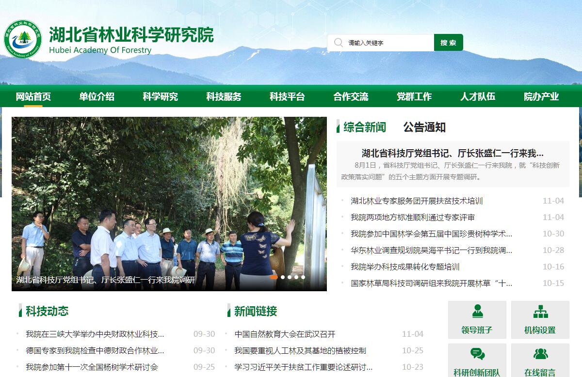 湖北省林业科学研究院建于1959年,是以应用研究和技术开发为主的省级林业综合性公益型科研单位。近年来,我院坚持围绕生态文明建设、全省林业中心工作和“绿满荆楚”行动,重点研究和解决湖北林业生产建设中的关键性技术问题,为林业工程建设、森林生态体系、林业产业化发展提供技术支撑, 为林农、林企增收做贡献。全院现有科技人员117人,其中正高职称21人、副高职称29人,博士10人、硕士28人,省中青年专家5人、享受国务院特殊津贴6人、省政府特殊津贴4人。全院设有生态环境研究所、经济林研究所、林业与园林研究所、森林保护研究所、资源信息研究所、林业产业研究所(省林产品质检站)等6个研究所,办公室、党群人事科、科管室(合作办)、财务科、《湖北林业科技》编辑部、公共实验中心、防火办和后勤中心等8个内设机构,九峰试验林场、九峰国家森林公园2个院属单位,以及九峰森林动物园、金安公司2个合资企业。与地方联建了湖北省林科院荆州分院、湖北省林科院襄樊珍稀树木园,以及安陆银杏研究所、咸宁竹类研究所、石首杨树研究所、鹤峰森林药材研究所、荆州平原林业研究所、襄樊珍贵树种研究所等6个专业研究所。先后组建了国家林业局林产品质量检验检测中心(武汉)、国家油茶科学中心北缘地区育种与栽培实验室、“园林植物材料引进及应用”国家引智成果示范基地、中国林科院兴林抑螺工程技术研究中心湖北分中心、湖北省速生丰产林工程技术研究中心、湖北省木本粮油林工程技术研究中心、湖北省湿地研究中心、经济林木种质改良与资源综合利用湖北省重点实验室、湖北省林业厅林业有害生物检验鉴定中心和湖北省林业厅林产品质量监督检验站。建院以来,先后主持国家、省科技攻关与支撑计划、“948”项目、自然科学基金项目、科技推广项目等400余项,取得各类科研成果、专利200余项,获得国家、省部级奖励156项,其中作为主持单位获得国家级科技进步一等奖1项、二等奖1项、三等奖4项,获得省部级科技进步及推广一等奖18项、二等奖44项、三等奖88项。近几年,先后获得“全国林业科技先进单位”、“全国绿化模范单位”、“国家生态文明教育基地”、“省级文明单位”、“湖北人才工作先进单位”、“湖北省科技特派员先进派出单位”、“科技服务湖北经济建设先进单位”等荣誉称号,进入湖北省“自然科学研究与试验发展”行业十强之列。2011年挂牌成立中国林业科学研究院湖北分院。