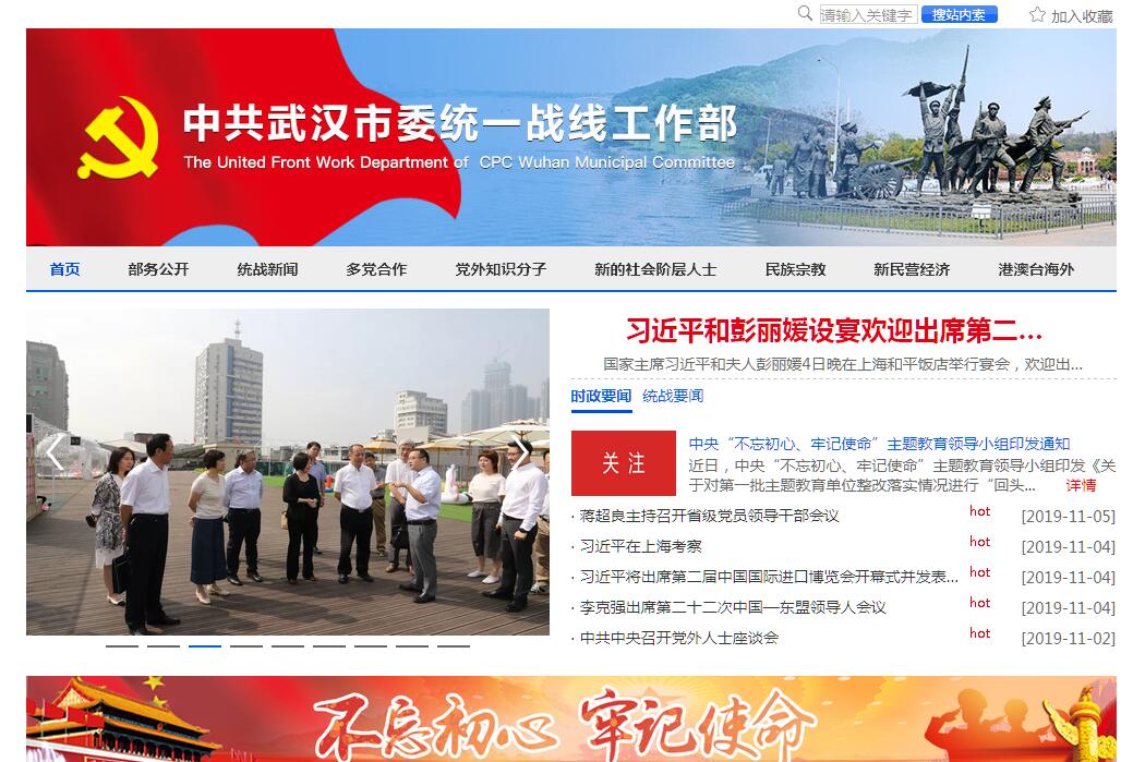 中共武汉市委统战部成立于1950年8月,是中共武汉市委主管统一战线工作的职能部门。主要职能和任务是贯彻执行中央和省委、市委关于统一战线的路线、方针和政策,加强与市各民主党派、工商联、无党派人士和有关人民团体的联系,积极开展非公有制经济领域、民主党派、民族宗教、港澳台及海外、党外知识分子和新的社会阶层等各个领域的统战工作,争取人心、凝聚力量,调动一切积极因素,化消极因素为积极因素,为实现市委制定的各项目标任务而团结奋斗。武汉市委统战部在新中国成立之初,为全市农业、手工业、资本主义工商业的社会主义改造,促进全市国民经济的恢复和发展做了大量的工作,为巩固新生的人民民主政权和维护社会稳定构筑起坚实的基础。许多成功的做法受到中央的高度重视,并得以在全国推广。“文革”期间,统战部的工作一度中断,1972年底恢复办公。党的十一届三中全会以后,武汉统一战线高举邓小平理论伟大旗帜,全面落实统一战线的各项政策,积极为社会主义现代化建设和促进祖国统一服务,实现了工作重点的战略转移,统一战线工作进人新的历史发展阶段。进入新世纪新阶段的武汉统一战线,在市委的正确领导下,在组织、宣传、财政等部门积极配合支持下,形成了全党重视统战、全社会支持统战工作的大好局面,多党合作和政治协商制度得到进一步的健全和完善;民主党派参政议政、民主监督的作用得到较好的发挥,自身建设得到明显加强,办公条件大为改善;引导非公有制经济代表人士积极参与助推“两型”社会建设、助推全民创业,非公有制经济健康快速发展;海外联谊面进一步拓展,招商引资工作屡有大手笔、大举措;认真贯彻党的民族宗教政策,呈现出民族团结、宗教和顺的新气象,为全市的社会稳定做出了新贡献;加强党外代表人士培养、选拔工作,党外人士的安排走在全省的前列。各个领域的统战工作的全面发展,使统一战线的法宝作用得到了充分的体现和发挥,形成了团结、稳定、振奋、活跃的政治局面,是我市统一战线历史上最好的时期之一。