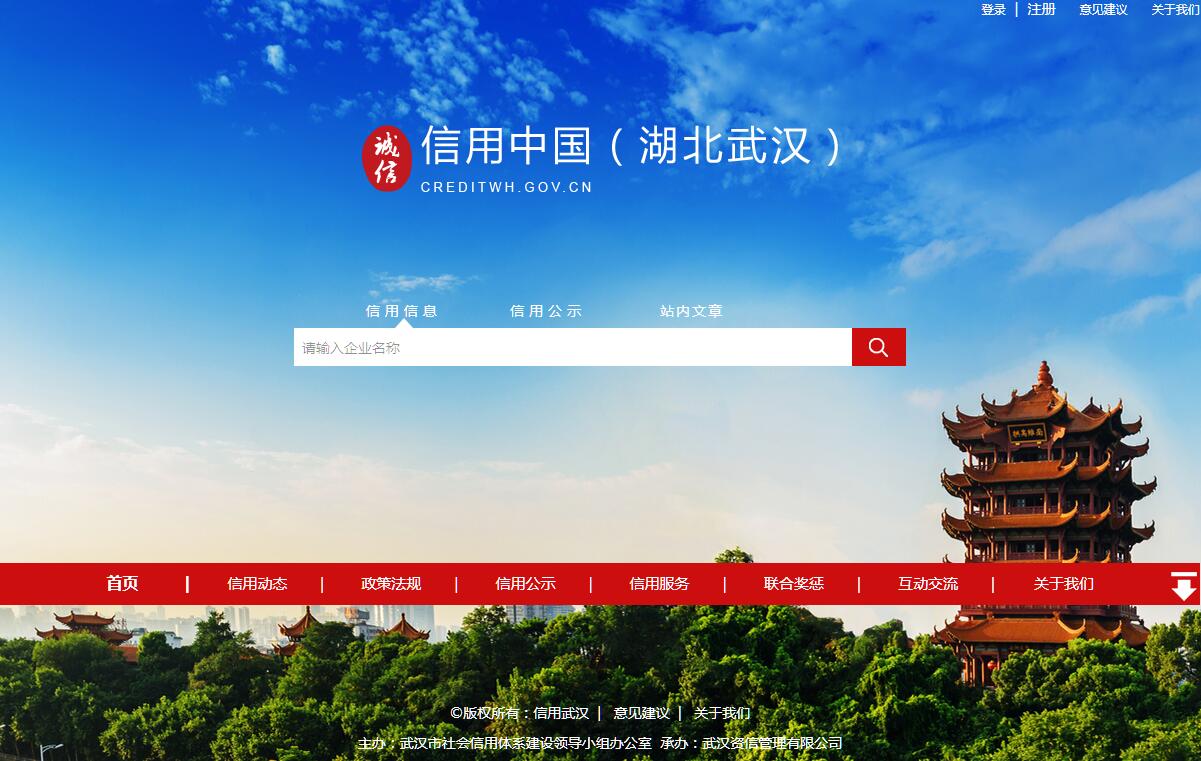 | 网站简介: “信用武汉”网站(以下简称网站)是武汉市褒扬诚信、惩戒失信的窗口,主要承担信用宣传、信息发布等工作,使用市辖区及市社会信用体系建设领导小组成员单位提供的对社会公开的信用信息。网站由武汉市发展和改革委员会主办,由武汉资信公司协办并提供技术支持及运维。 |