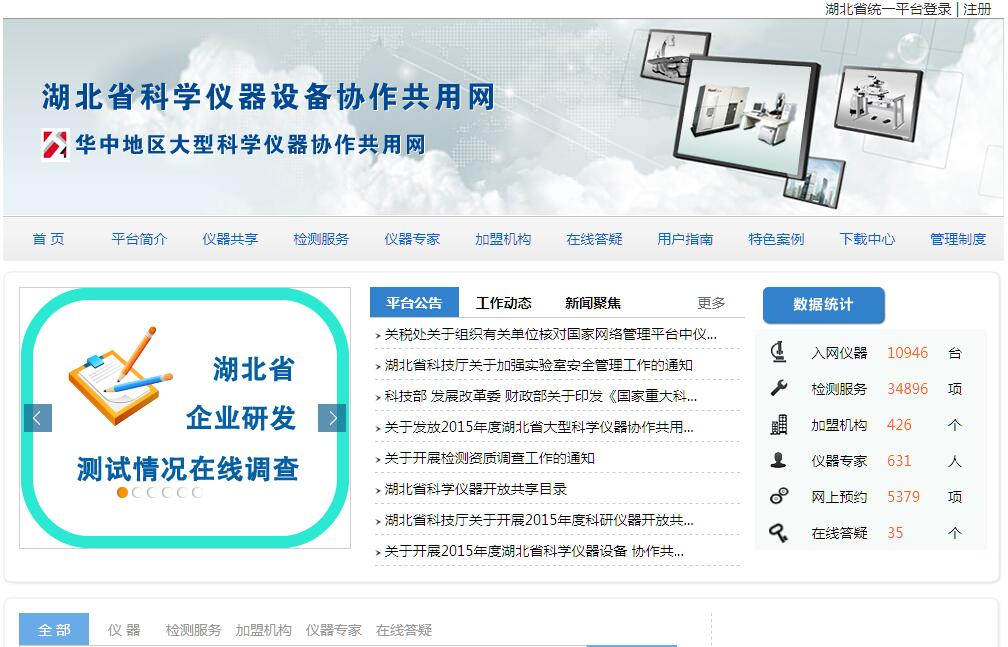 “湖北省科学仪器协作共用网”是在国家科技部、湖北省科技厅的支持和指导下,按照“整合、共享、创新、服务”原则建立的面向全社会开放服务的科学仪器协作共用网,该网对湖北省现有大型科学仪器及相关信息资源进行整合,为本省科学仪器资源的综合利用提供有力支持。由省科技厅、省财政厅、武汉市科技局、中科院武汉分院、东湖高新技术开发区、湖北省科技信息研究院等单位组成,负责协调共同推进大型仪器的开放共享及指导工作,负责审批运行补贴的发放和奖励结果。负责对平台建设的规划、工作计划、经费预算进行审定,监督共享基金投向和使用效果。湖北省科技平台建设主管单位省科技厅负责平台项目的立项、 地方配套资金的筹措,审定资金的年度预算,提出项目建设指导意见,对项目中重大事项做出决议;协调省内各单位之间的关系,发布政策性的文件,审定并出台各项规章制度,并对平台工作和资金投向进行考核和绩效评估。湖北省大型科学仪器协作共用网管理办公室(代理行使华中区域大型科学仪器管理办公室职责)依托于湖北省科技信息研究院完成区域子项目的工作实施。协调湖南、河南、江西各省仪器平台的共同参与平台建设工作。湖北省管理办公室还负责本省大型科学仪器协作共用工作,负责本省协作共用规章制度的制定;负责平台资源采集、保存、加工,负责用户与机组之间协调沟通,在省内全面开展协作共用宣传、服务工作,发放运行补贴和用户补贴等等。