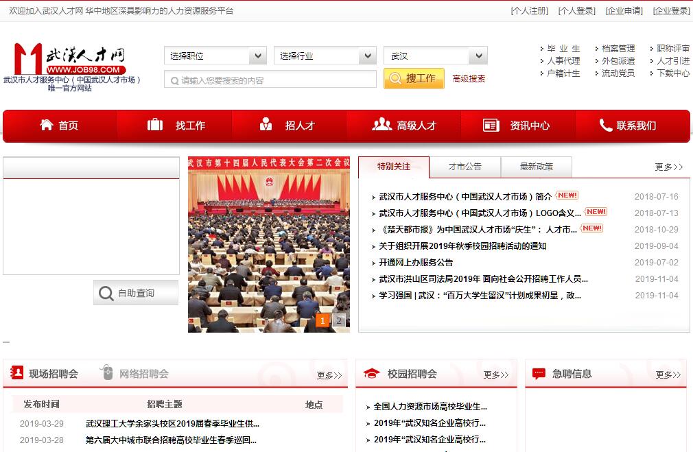 武汉市人才服务中心(简称:武汉人才)成立于1983年,是隶属于武汉市人力资源和社会保障局的公益一类事业单位。同时,接受武汉市招才局的业务指导和工作安排。1995年,经原国家人事部批准,由原国家人事部、湖北省人民政府和武汉市人民政府共同组建了华中地区唯一的国家级区域性人才市场——中国武汉人才市场,与武汉市人才服务中心实行“两块牌子,一套班子”运作。2016年,增挂武汉“城市合伙人”服务中心的牌子。2017年,增挂“武汉市高层次人才服务中心”的牌子,增加承担我市高层次人才联系服务等工作职责。武汉市人才服务中心现有武汉人才网、“武汉人才”微信公众号、“武汉人才”官方微博等对外信息发布平台。其中,武汉人才网(www.job98.com)于1998年注册运营,是武汉市人才服务中心唯一官方网站,为各类人才和用人单位提供权威、高效、专业的公益性线上人力资源服务。“武汉人才”微信公众号(微信号:whrcjob98)和“武汉人才”官方微博(http://weibo.com/wuhanrencai)主要发布武汉市人才服务中心各类公共服务信息,包括文化建设、形象宣传、重要事项、大型活动及行业动态等。近年来,作为政府公共人才服务机构,武汉市人才服务中心充分发挥在人力资源配置中的基础性作用,形成了面向全球、辐射全国的市场格局,每年为国内外数百万大学生、万余名流动党员和千万创业创新主体对象提供了全方位、高效率的人事人才服务,已成为我市重要的大学生就业创业服务平台、海内外高层次人才服务平台和流动党员活动中心。目前,在武汉市人社局、武汉市招才局的正确领导下,武汉市人才服务中心积极应对新常态下人才服务工作的新形势和新要求,围绕“百万大学生留汉创业就业工程”、武汉“城市合伙人”计划、人才公共服务“三办”改革等重点任务,在创新人才公共服务体制机制和优化内部管理流程等方面做出了一系列有益探索,为我市经济社会发展提供了坚实的人才智力保障。
