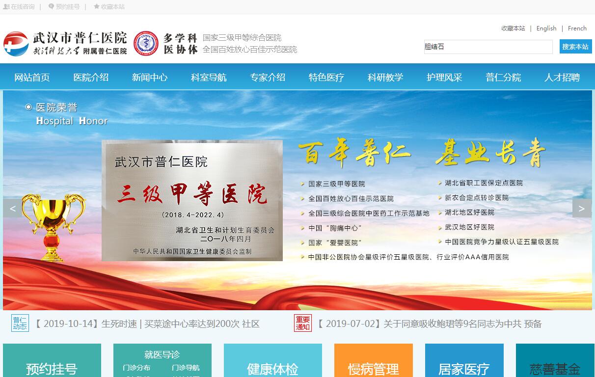 在武汉长江主轴核心区,长江之滨、青山脚下,有一所特色突出、远近闻名的医院——武汉市普仁医院。武汉市普仁医院创建于1955年,经过六十余年的发展,现已成为一所学科门类齐全,英才名医荟萃,诊疗设备先进,医疗技术精湛,管理方法科学,科研成果丰硕,设施环境温馨,医疗特色突出,集医疗、预防、科研、教学、康复、保健于一体的大型现代化三级甲等综合性医院。开设科室齐全,英才名医荟萃。医院设有内科、外科、妇科、儿科、肿瘤科、眼科、口腔科、耳鼻喉科、康复科、中医针灸科等26个一级诊疗科目,46个二级诊疗项目。开放床位1550张,其中,神经内科、内分泌科是省市两级重点专科,心血管内科、康复医学科、普外科、儿科、骨科、疼痛科、肛肠科、肿瘤科、放射科、病理科、临床药学及临床护理是武汉市重点专科,感染科是武汉市重点建设专科,心血管内科、消化内科、肾内科、神经外科、肝胆外科、泌尿外科、骨科、妇产科、肿瘤科、中医针灸康复科等,在武汉地区享有较高知名度和良好声誉,疼痛科是国家中医药管理局临床技术推广培训基地。医院现有员工2000余人,其中,教授/主任医师、副教授/副主任医师等高级职称200余人,中级职称400余人,博士、硕士200余人,外聘国内外知名客座教授10余人,与法国桑利斯瓦卢瓦医院结成姊妹医院,定期开展人员交流和技术合作。各学科带头人均在省市级以上专业技术学会任职,保持与国内外医疗单位在学术与技术层面的大交流、大合作、大融合。诊疗设备先进,设施环境温馨。医院拥有直线加速器、PET-CT、64排螺旋CT、3.0T-MRI、1.5T-MRI、DSA、DR、大型X光机、四维彩超、体外冲击波碎石机、钬激光碎石机、经尿道输尿管镜气压弹道碎石机、高端电子腹腔镜、高端手术显微镜、电子胆道镜、椎间孔镜、宫腔镜、阴道镜、电子喉镜、电子支气管镜、电子胃镜、电子肠镜、动态心电图、运动平板、大型全自动生化分析仪、化学发光仪、血液透析机、床边血透机、等一系列大中型先进诊疗设备200余台套,以及现代化的层流空气净化ICU病房和手术麻醉间。医疗设施人性化,医院管理智能化,处处体现人文关怀;院内环境亮化美化,便捷温馨,有利于病患身心康复。医院管理科学,科研成果丰硕。医院按照《国家三级综合医院评审标准》和《国际医院评鉴标准(JCI)》实施科学管理,有序推进和提高医院病人安全、医疗服务和质量管理工作,实现了年门诊量100余万人次,年住院量6万余人次,年手术量1.6万余台次的医疗业绩。医院秉持制度管人、规范教人、文化育人的理念,带来了人才的聚集,激发了员工的活力,实现了医院的发展。医院成立“院士专家工作站”,引进高层次人才,为医院高质量发展提供有力技术支持。医院每年引进新技术、新项目30项以上,每年在省级以上医学期刊发表优秀医学论文100余篇,每年申报市级以上科研项目15项以上,累计60余项科研成果通过省部级以上鉴定。并且承担湖北省住院医师规范化培训任务。武汉市普仁医院武汉市职工医保和居民医保定点医疗机构、武汉市新农合市级转诊定点医疗机构、湖北省职工医保、新农合省级转诊定点医疗机构,湖北省首批医保全国联网异地实时结算医院,同时,也是医保门诊重症和慢性病鉴定医疗机构、武汉市工伤及生育保险定点医疗机构、武汉市120急救中心青山分站及122交通事故救治中心,是青山区公安分局警察救治指定医院,湖北省保险业协会(中保、平安、泰康、太平洋等商业保险)指定合作医院。下辖普仁江岸医院、普仁广惠医院、普仁青船医院、普仁利平医院、武汉洪山复新医院、武汉471医院及3个社区卫生服务中心、10余个社区卫生服务站。武汉市普仁医院是武汉科技大学附属医院第四临床医学院、是“全国三级综合医院中医药工作示范基地”、国家“胸痛中心”、“心衰中心”、国家“爱婴医院”,“湖北省职工医保、新农合定点转诊医院”,“武汉市文明单位”、“武汉市物价信得过单位”、“湖北省绿化红旗单位”,2015被评为“湖北地区好医院”和“武汉地区好医院”。2017年通过三级甲等医院评审,获得“中国医院竞争力星级认证五星级医院”,中国非公立医疗机构协会“行业评价AAA信用医院”,中国非公立医疗机构协会“医院星级评价五星级医院”。武汉市普仁医院以“技术领先、服务优质、群众满意、社会信赖”为宗旨,秉承“客户为源,诚信为先,员工为本、创新为魂”的核心价值观,发扬“创新、求实、敬业、博爱”的医院精神,遵从“关爱生命,以人为本”的院训,以最大的热忱和优良的技术服务百姓,回报社会!