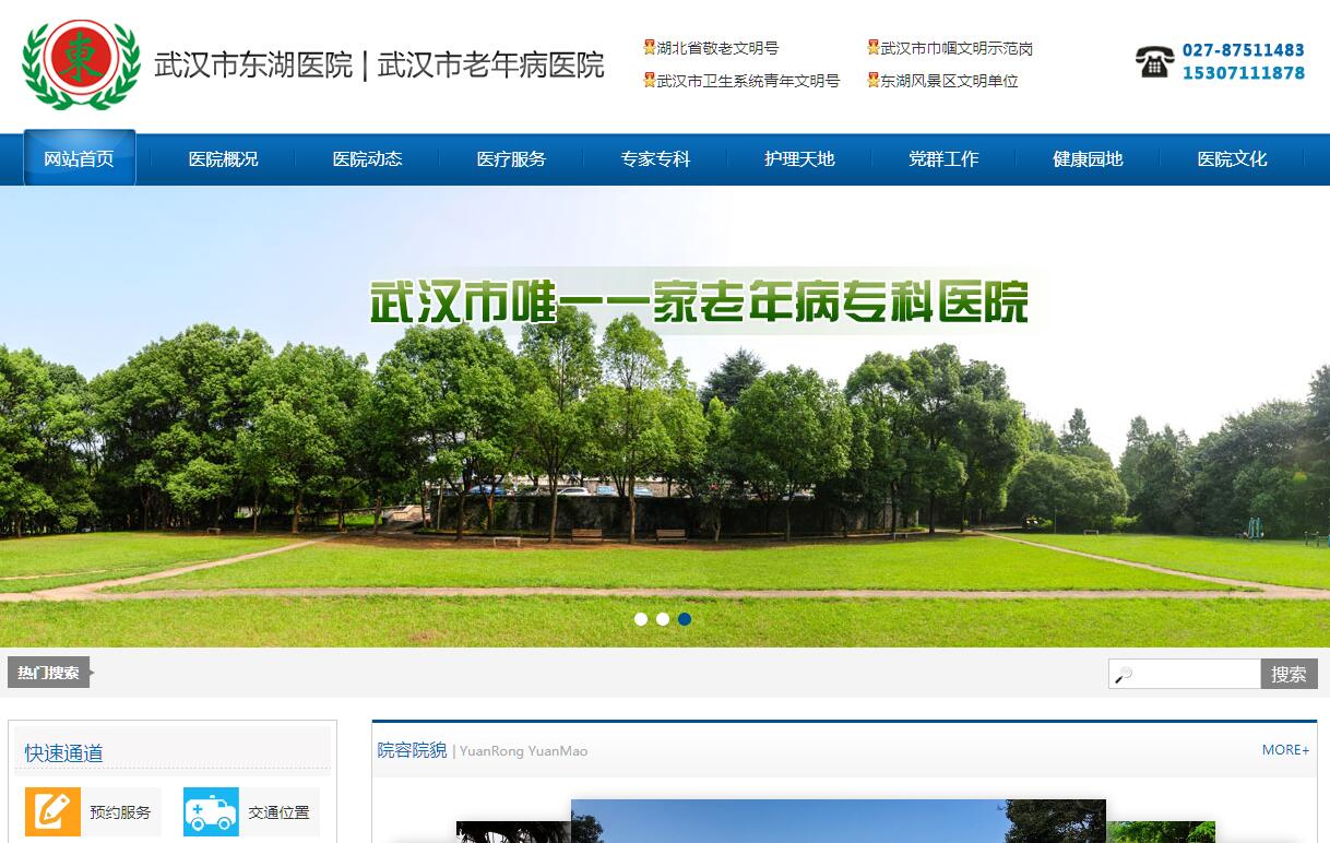 武汉市东湖医院(武汉市老年病医院)前身为1910年由俄、法、德、英四国工部局联合组建的"万国医院",1950年由武汉市人民政府接管,成立武汉市第一家干部疗养院。1973年更名为"武汉市东湖医院",成为以收治老年疾病为主的综合性医疗机构。1999年10月经武汉市编制委员会批准,挂牌为"武汉市老年病医院"。经过一个多世纪的建设,医院已发展成为一所集预防、医疗、保健、康复、体检、健康管理于一体的武汉市公立老年病专科医院,是湖北省、武汉市老干部定点医院、武汉市首批医保定点医疗单位、湖北省针灸推拿康复专科联盟理事单位、武汉市城市圈中医联盟成员单位、武汉地区康复医学发展联盟单位,是武汉体育学院健康科学学院专业教学实习基地。医院设有内、外、妇、口腔、五官、皮肤、眼科、高压氧科、放射科、功能科、检验科、药剂科等临床和医技科室,建有老年保健中心、康复治疗中心、健康体检中心,承办东湖风景区第二社区卫生服务中心,并设有八个军休医疗服务点。配备CT、DR、彩超、动态心电图、心功能监测仪、动态血压监测、全自动大型生化分析仪、中风预测仪、高压氧舱等诊疗设备,引进了日本全套帕维尔康复系统等先进康复设备,形成功能完备的老年疾病诊疗康复体系,尤其对老年慢病健康管理、中风偏瘫康复等有系统的研究,以精湛的技术,优质的服务赢得社会及病人赞誉。先后被授予“湖北省卫生系统先进单位”、“湖北省敬老文明号”、“省级模范职工之”家、“武汉市五星级民主管理单位”、“武汉市巾帼建功先进集体”等荣誉称号。