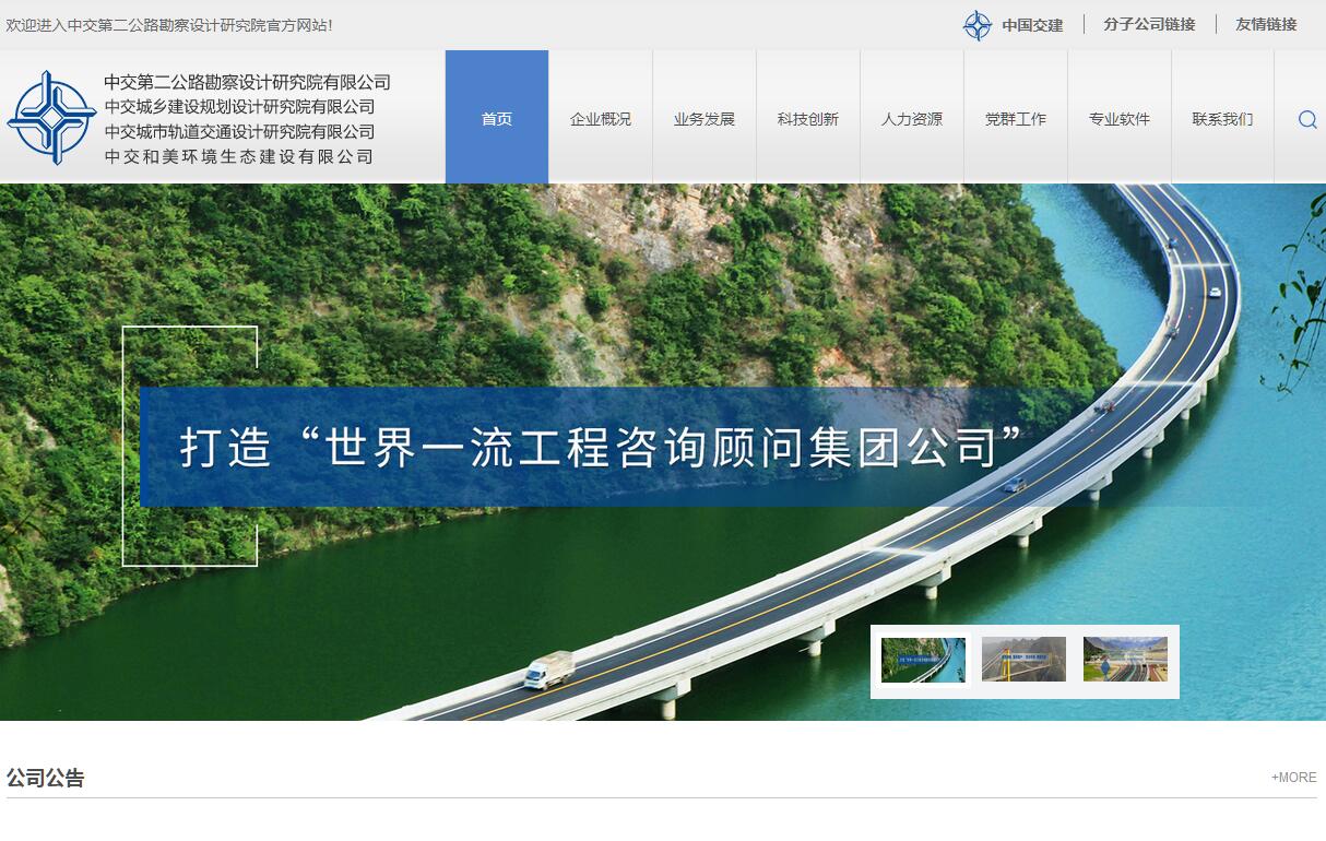 | 网站简介: 中交第二公路勘察设计研究院有限公司是世界500强中国交建的全资子公司注册资本8.7亿元人民币。我国公路勘察设计行业综合实力最强的企业之一,连年入榜“中国工程设计企业60强”,是国家高新技术企业、全国工程勘察设计先进企业,“中交二公院®”获湖北省著名商标。公司具有公路、桥梁、隧道、交通工程、市政、轨道、建筑、环境生态、岩土与地下工程等专业领域的规划咨询、项目策划、勘察设计、投资建设、项目管理、工程总承包以及运营管理等全产业链技术服务能力,具有承担国家级重大科研项目开发和编制行业技术标准、规范、手册、指南的技术实力。公司始终秉承“诚信服务、优质回报、不断超越”的企业宗旨,愿与世界同行广泛携手,为全球基础设施建设做出更大的贡献! |