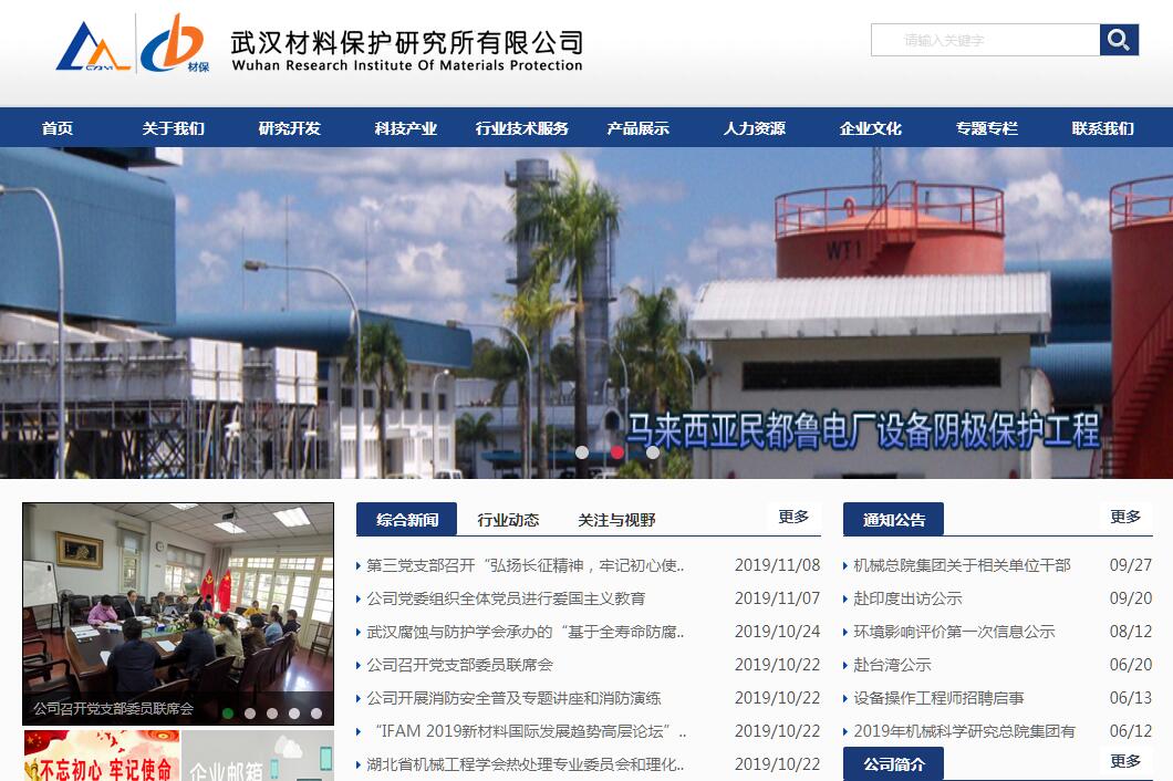 武汉材料保护研究所有限公司始建于1953年,原为机械工业部直属大型骨干研究所,随着我国科技体制改革的发展,转制为科技型企业,2017年11月,进行公司制改制为武汉材料保护研究所有限公司。现隶属于国务院国有资产管理委员会管理的机械科学研究总院集团有限公司。经过60余年的发展,武汉材料保护研究所有限公司已成为表面处理工艺、材料、设备的研发与生产,表面覆盖层性能测试、产品质量检测,表面保护工程设计与施工的高新技术企业。武汉材料保护研究所有限公司占地130亩,其中科技成果产业化基地80亩。拥有一批表面工程领域的精英人才,其中研究员40余人,高级工程师80余人,享受各级政府津贴专家15人。具有博士学位与硕士学位授予权。武汉材料保护研究所有限公司设有电沉积、化学沉积、等离子体表面技术、涂料涂装、防锈封装、表面化学转化、化学热处理、热喷涂(焊)、激光表面改性、缓蚀技术、摩擦磨损、环境腐蚀及表面保护工程等专业,从事表面工程领域的共性技术研究、产品开发与生产、性能与质量检测及防腐蚀工程设计与施工。先后承担一大批国家、省、市重大科研项目,其中包括科技部“973”、“863”计划及国防军工科研项目等。建所以来,已取得科技成果600多项,大部分成果达到国际或国内先进水平,得到市场推广应用,并获得各级政府奖励和国家专利。武汉材料保护研究所有限公司成立以来,一直是表面工程行业的骨干单位,目前挂靠(驻所)在本所的创新平台和行业组织有:特种表面保护材料及应用技术国家重点实验室、工业产品(特种表面保护材料)质量控制和技术评价实验室、中国表面工程协会、国家电镀技术生产力促进中心、机械工业表面工程技术研究中心、湖北省表面工程技术研究中心、机械工业表面覆盖层产品质量监督检测中心、中国机械工程学会表面工程分会、中国机械工程学会摩擦学分会、中国腐蚀与防护学会涂料涂装及表面保护技术委员会、中国表面工程协会转化膜专业委员会、全国金属与非金属覆盖层标准化技术委员会及湖北省腐蚀与防护学会等。武汉材料保护研究所有限公司具有规范、高效的管理与运行机制,通过ISO9001质量管理体系认证。