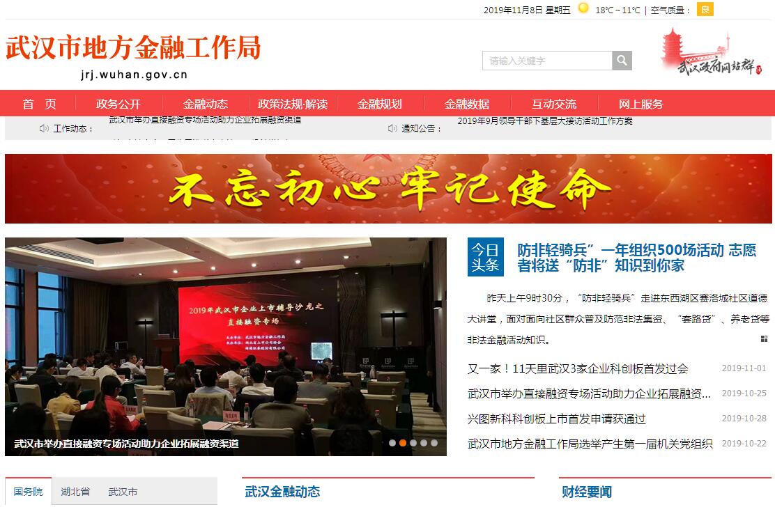 武汉市地方金融工作局贯彻落实党中央和省委关于地方金融工作的方针政策和决策部署,落实市委工作要求,在履行职责过程中坚持和加强党对地方金融工作的集中统一领导。其主要职责是:(一)组织起草促进全市金融业发展等地方性法规、市政府规章草案及有关规划、政策措施并组织实施。(二)拟订促进金融服务全市经济社会发展的政策措施,引导金融机构加大对全市经济社会发展的支持力度。协调相关部门、各区政府及金融机构共同推进区域金融中心建设、金融改革创新等工作。(三)负责协调联络国家金融管理部门、金融机构及其驻汉分支机构,开展对外金融交流。(四)拟订促进社会融资发展的政策,参与拟订市政府重大项目融资方案,为重点工程、主导产业、主要区域发展和企业发展提供融资服务。(五)负责拟上市企业的培育和服务工作,会同有关部门指导协调上市公司并购、重组,促进企业规范发展。推进资本市场建设,完善多层次资本市场体系。指导推动创业投资基金、股权投资基金规范发展。推动做好上市公司再融资及债券融资等直接融资工作。(六)依法依规开展对全市小额贷款公司、融资性担保公司、区域性股权市场、典当行、融资租赁公司、商业保理公司、地方资产管理公司等地方类金融机构的相关管理工作,负责引导地方类金融机构规范发展。(七)配合国家和省金融管理部门整顿和规范全市金融秩序,防范、化解和处置各类地方金融风险。推进地方金融风险监测预警体系建设,完善金融突发事件应急处置机制。协调落实市委、市政府防范处置非法集资等非法金融活动的工作部署。协调推进互联网金融清理整治工作。会同有关部门加强全市信用体系建设,推进改善金融生态环境,推进全市金融安全知识宣传普及工作。(八)对各区政府地方金融管理工作进行业务指导,推进市区联动机制建设。参与、指导全市金融人才资源培育和队伍建设工作。(九)按规定承担全面从严治党、国家安全、意识形态、综治维稳、精神文明建设、安全生产、生态环境保护、保密等主体责任。(十)承办上级交办的其他工作任务。