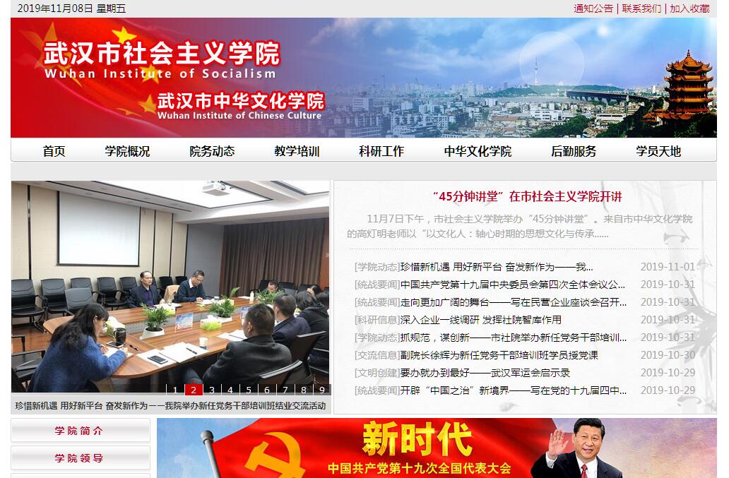 武汉市社会主义学院(简称武汉社院)是中共武汉市委领导的统一战线性质的政治学院,是市各民主党派和无党派人士的联合党校。武汉社院的基本职能是:教育培训武汉市民主党派成员和无党派人士,提高他们的理论政策水平和参政议政能力;教育培训武汉市统一战线其他方面的代表人士,提高他们的政治素质,增强爱国主义精神,自觉维护民族团结和社会稳定;教育培训武汉市统一战线工作干部,提高他们贯彻执行党的路线、方针、政策的自觉性和胜任本职工作所需要的统战理论政策水平和领导能力;研究和宣传马克思列宁主义、毛泽东思想、邓小平理论、“三个代表”重要思想和科学发展观;研究和宣传党的统一战线理论、方针和政策,不断提高统一战线理论研究的水平。围绕武汉市统一战线工作的新情况新问题,开展调查研究,为市委、市政府的决策服务;配合有关部门对市各民主党派和无党派学员在培训期间的表现进行考察,为培养、使用党外后备干部提供参考;接受中央社会主义学院、湖北省社会主义学院的业务指导,指导区社会主义学院培训工作;承担市委、市政府和市委统战部交办的其他任务。建院至今,在中共武汉市委、市政府的高度重视和亲切关怀下,在市委统战部的指导下,在市各民主党派、无党派人士以及社会各界的大力支持下,学院坚持社会主义的办学方向,坚持理论联系实际,树立人才资源是第一资源的观念,解放思想,实事求是,与时俱进,开拓创新,贯彻落实科学发展观的要求,以教学为中心、以科研为基础、以行政后勤服务为保障,我市一批与中国共产党长期亲密合作的民主党派、无党派人士和统一战线其他方面的代表人士以及德才兼备的统战工作干部曾在我院培训学习过,为全市统一战线工作,为武汉市全面建设小康社会和武汉市“两型社会”建设作出了应有的贡献。共举办各类培训班200余期,培训学员近万人次,为坚持和完善中国共产党领导的多党合作和政治协商制度,巩固和发展爱国统一战线培养了一大批骨干力量。培训的学员中有39人担任了副局级以上领导职务;有129人担任了处级领导职务;有255人次当选为全国、省、市政协委员;有172人次被聘请为特约“四员”。学院科研工作取得丰硕成果。与设在学院的中国统一战线理论研究会“国共两党关系史和海峡两岸关系史”研究中心一道,组织一批专家学者开展富有特色的科研活动。近几年来,先后举办了6次全国性的学术研讨会和3次全院性的理论研讨会以及多次小型专题研讨会。编辑出版了《国共关系与两岸关系丛书》20卷。组织编写了《正确认识和理解中国特色的政党制度》等7本统战理论读本。完成了中央统战部交办的《中国共产党统一战线史》有关章节的编写任务。发表学术论文200余篇。武汉市社会主义学院成立于1990年5月,为正局级事业单位,设立了院党组。现设党组书记1名,由市委常委、统战部部长担任;院长1名,由政协副主席、民主党派主委担任;党组副书记、副院长1名(分管日常工作);党组成员、 副院长2名。内设办公室、教务处、教研室、总务处4个处级机构。学院占地面积15亩,建筑面积9000余平米,建有教研楼、办公楼、学员楼,可容纳200人同期在校学习培训。图书室藏书5000余册。为学员提供文体活动场地。学院除教研室自有教师外,常年聘请一批专家、学者和市委、市政府等党政部门领导以及市各民主党派的领导担任兼职教授,建立了一支高水平的专兼职教师队伍。根据中央统战部《关于印发<社会主义学院工作暂行条例>的通知》(统发[2003]69号)文件精神,武汉市社会主义学院增挂“武汉中华文化学院”牌子,为一个机构,两块牌子。其任务是以爱国主义为宗旨,积极开展面向港澳台同胞和海外华侨华人进行中华文化为主要内容的学习、研究和交流活动,弘扬爱国主义精神和中华民族优良传统,推动中华民族的大团结、大联合,促进祖国完全统一。