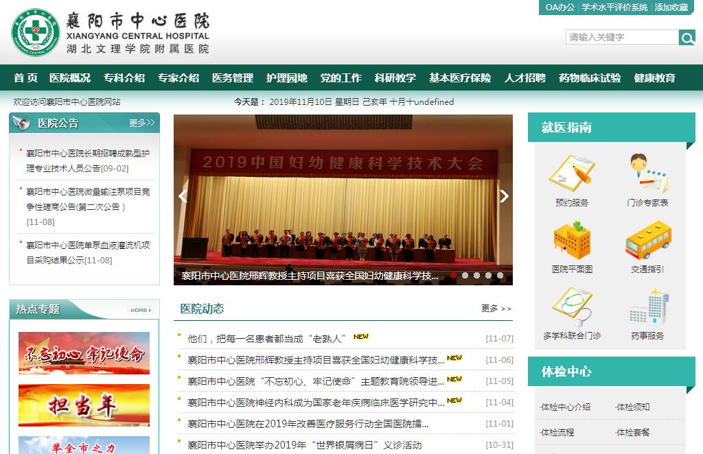 襄阳市中心医院(湖北文理学院附属医院),是湖北省卫健委重点建设的省级区域性医疗中心,是国家卫健委批准的湖北省首批三级甲等医院、国际爱婴医院、国际紧急救援中心网络医院、国家药物临床试验机构,综合实力名列湖北省医疗行业“十强”,2018年香港艾力彼医院管理研究中心对全国地市级医院进行排名,我院排名第34位。医院始建于1949年7月1日,现有规模分为南院区(原襄阳市中心医院)、北院区(原襄阳铁路中心医院)、东津院区,共有建筑面积43.5万平方米。医院拥有一大批优秀专业技术人才,其中一级主任医师8人,二级主任医师16人,三级主任医师101人;博士、博士后80多人,硕士近800人;正、副教授59名,武汉大学医学部博士研究生导师1名,硕士研究生导师7名,生物医学工程硕士生导师10人;享受国务院津贴专家7人,省政府专项津贴专家4人,省有突出贡献中青年专家5人,市政府专项津贴专家18人,湖北省首届医学领军人才1人,湖北省高端人才引领计划人才1人,襄阳市“隆中名医”24人,襄阳市高层次卫生人才32人,襄阳市优秀卫生管理人才1人。医院定编病床位3800张,设79个病区,71个专科,年门急诊量185万余人次,年出院病人12.8万余人次,年手术7.3万余台次。医院拥有PET_CT、SPECT、3.0T磁共振、128排CT、数字减影仪(DSA)、DR、直线加速器(IGRT)、全飞秒激光、心脏彩超、四维彩超、各种内窥镜、高压氧舱、全自动生化免疫分析流水线、全自动血液检测流水线等十万元以上医疗设备880多台(套),价值近5.2亿元。随着医学科技的快速发展,主动脉瓣及主动脉窦成形加升主动脉及全弓置换为代表的复杂心脏外科技术、侧颅底入路颅底肿瘤显微手术治疗、大血管杂交技术、3D腹腔镜下精准外科技术、异基因造血干细胞移植术、人工耳蜗移植技术、肿瘤精准治疗技术、PET-CT诊断技术等高新技术在我院得到了广泛应用,我院生殖医学、基因诊断技术已达国内先进水平,在省内同级医院中居领先地位。医院先后有心血管内科、妇科、产科、心胸外科、泌尿外科、神经外科、眼科、检验医学部、耳鼻咽喉科、儿科、麻醉科、肿瘤科、护理、影像科、呼吸内科、神经内科、消化内科、急诊科、普外科、血液内科、骨科、新生儿科、重症医学科、内分泌科、超声科、输血科等26个科室被评为湖北省省级重点专科,另有市级重点专科30多个。近十年,医院获得各级各类科研立项课题212项,其中国家自然科学基金项目10项;湖北省自然科学基金22项(其中重点项目2项);其它各类别省、市级项目110项;中国医师协会专项基金1项;国家卫生计生委行业科研专项基金1项;湖北省高端人才引领计划项目1项;湖北省首届医学领军人才1项;2015年市科学技术突出贡献奖1项。医院共有106项科研成果获省、市(厅)级科技奖励,其中湖北省科技进步奖一等奖1项,湖北省成果推广奖一等奖1项,湖北省科技进步奖三等奖8项。在专利方面,获实用新型专利313项。发表论文总计3276篇,其中SCI论文262篇、中华系列127篇、北大核心441篇、科技统计源2009篇。医院2010年成为湖北文理学院附属医院,同时成为湖北文理学院医学院第一临床学院,湖北文理学院医学院开设临床医学、护理学、临床检验技术三个本科专业,现有在校生1400余人,留学生120名。医院还是华中科技大学同济医学院、武汉大学医学部等多所院校的教学医院,并承担多所院校的本科生及研究生教育,2010年成为湖北省首批住院医师规范化培训基地,2014年被认定为全国首批住院医师规范化培训基地,下设22个专业基地。医院先后荣获“全国卫生系统先进集体”“全国巾帼文明岗先进集体”“全国医院文化建设先进集体”“湖北五一劳动奖状”,被湖北省委授予“全省思想政治工作先进单位”“先进党委”称号,被省卫生计生委评为“示范医院”“湖北省三级优秀医院”;近年来连续五次被评为“省级最佳文明单位”。