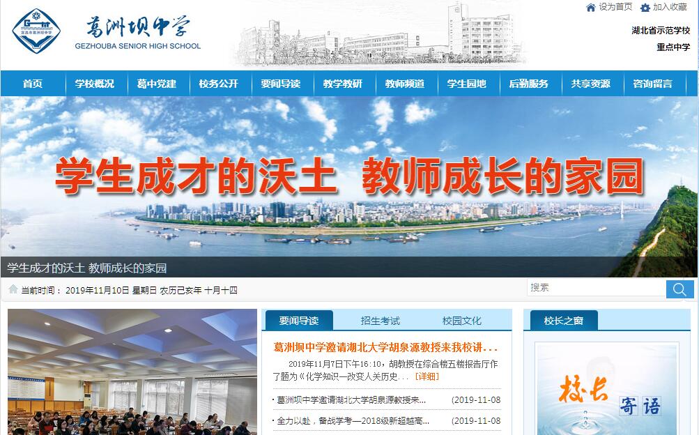宜昌市葛洲坝中学(原葛洲坝六中、葛洲坝高级中学、宜昌市第二十中学)是中国葛洲坝集团公司于1981年正式创办的一所重点高中。1993年跻身湖北省28所重点中学行列,是与武钢三中等知名学校齐名的重点中学。2000年被湖北省人民政府教育督导室命名为“示范学校”。办学以来,学校为国家培养了大批优秀人才,先后向北大、清华输送30多名优秀学生,向中科大、武大、华科大等高校输送了20名少年大学生;产生了9名宜昌市文科、理科、外语类高考状元。学校167名教职工中,特级教师1人,正高职教师4人,“宜昌名师”6人,省骨干教师和宜昌市学科带头人12人,高级教师71人,硕士研究生38人,为宜昌市教师高学历比例最高的学校。学校是全市唯一一所荣获“三峡质量奖”提名奖的学校,先后荣获全国“群众体育运动先进单位”、“校园环境文化艺术建设先进单位”、“全国教育科研先进单位” 荣誉称号;荣获湖北省“文明单位”、“新课程改革先进学校”、“湖北省平安校园”、“湖北省校园文化建设百强学校”、“比访工作先进学校”、“校园管理优秀学校”荣誉称号;荣获宜昌市“教育质量奖”、“群众满意的中小学”、“优秀学校”、“廉政文化进校园示范点”、“美丽校园”、“宜昌市先进基层党组织”等荣誉称号。