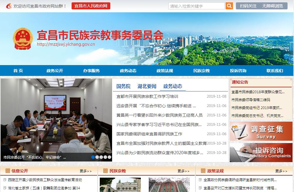 宜昌市民族宗教事务委员会是市政府工作部门,负责宜昌市辖区内民族宗教事务管理。其主要职责是:(一)贯彻执行党和国家关于民族宗教工作的方针、政策;组织开展民族宗教理论、政策和重大问题的调查研究,提出相关建议和意见。(二)负责协调推动有关部门履行民族宗教工作相关职责;对政府系统民族宗教工作进行业务指导;会同有关部门做好对口支援西藏建设工作。(三)研究拟订民族宗教工作相关政策并推动落实;负责民族区域自治制度、民族宗教事务法律法规和民族政策执行情况的督促检查以及民族文化、宣传教育工作,指导少数民族古籍的收集、整理、出版等工作。(四)研究提出协调民族关系的工作建议,协调处理民族关系中的重大事项,保障少数民族的合法权益;参与协调少数民族和民族地区社会稳定工作;组织开展民族团结进步创建活动,承办市人民政府民族团结进步表彰事宜,协调指导市辖民族自治县、民族乡、民族村重大庆典活动。(五)负责拟订少数民族事业发展专项规划,监督检查规划实施情况;参与拟定少数民族和民族地区经济社会相关领域的发展规划,促进建立和完善少数民族事业发展综合评价监测系推进实施民族事务服务体系和民族事务管理信息化建设。(六)研究分析少数民族和民族地区经济、社会事业发展方面的问题,协调或配合有关部门处理相关事宜;参与协调民族地区科技发展、对口支援、扶贫开发和经济技术合作等有关工作。(七)会同外事主管部门负责全市宗教方面的外事归口管理工作,组织协调民族宗教工作领域有关对外和对港澳台的交流与合作,参与涉及民族宗教事务的对外宣传工作。(八)指导宗教团体依法依章开展活动,支持宗教团体加强自身建设,指导宗教团体开展各类学习培训活动,推动宗教团体在宗教界开展爱国主义、社会主义、拥护祖国统一和民族团结的自我教育,办理宗教团体需由政府解决或协调的有关事务。(九)依法保护公民宗教信仰自由和正常的宗教活动,维护宗教界合法权益,促进宗教关系和谐;处理宗教方面的重大事件,防范利用宗教进行的非法、违法活动,抵御境外利用宗教进行的渗透活动。(十)参与拟定全市少数民族人才队伍建设规划,承担联系少数民族干部的具体工作,负责培训基层民族宗教工作干部,协助有关部门做好全市少数民族干部的教育培养和使用工作。(十一)承办上级交办的其他事项。
