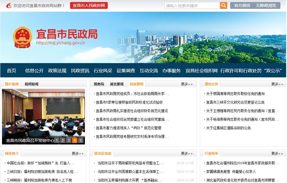 宜昌市民政局,是市人民政府主管社会行政事务的职能部门,其主要职责是:(一)根据全市国民经济和社会发展规划,编制民政事业中长期发展规划和年度工作计划。(二)主管社团登记、管理和监督工作。承办全市性社团的成立、变更、注销登记及年检工作;监督社团活动,查处社团组织的违法行为和未经登记而以社团名义开展活动的非法组织;负责社团行政复议;指导全市社团登记管理工作。(三)主管民办非企业单位登记和监督、管理工作。承办全市性民办非企业单位的成立、变更和注销登记;负责民办非企业单位行政复议;指导全市民办非企业单位登记管理工作。(四)主管拥军优属、优待抚恤和烈士褒扬工作。制订优抚对象优待抚恤具体实施办法并监督实施;管理复员退伍军人、国家机关和群众团体工作人员及参战民兵、民工的评残;负责特、一等伤残军人的安置与供养;承办革命烈士的上报审批;指导烈士陵园和烈士纪念建筑物、优抚医院、光荣院的管理;承担市拥军优属拥政爱民工作领导小组的日常工作。(五)主管军队离退休干部、退役士兵的接收安置工作。负责军休所的建设和管理;协调落实军休干部的政治、生活待遇;指导开展退伍军人职业技能培训;负责军供站建设。(六)主管救灾救济工作。组织查核和反映灾情,参与当地政府紧急转移、抢救和安置灾民;组织慰问、救助灾民;管理发放救灾款物,检查监督救灾款物的使用;组织、指导救灾捐赠;指导救灾物资的储备和发放工作。(七)主管城市居民最低生活保障工作。筹措安排城区最低生活保障金;指导督促城市最低生活保障制度的实施。(八)主管城乡基层政权建设和基层群众自治组织建设。指导村民委员会的民主选举、民主决策、民主管理和民主监督工作;指导村务公开和基层民主政治建设;指导社区居委会建设。(九)主管婚姻登记管理和儿童收养工作。指导婚姻登记管理和儿童收养登记。(十)主管行政区划和地名管理工作。负责乡级以上行政建制的设立、撤销、更名和行政区域变更的审核报批;负责乡(镇)以上行政区划名称的命名、更名的审核报批;负责城区道、路、巷标准地名标志的设置和城区街道、路、巷地名的命名、更名申报;负责市内标准地名图书资料的审定;负责与毗邻地区行政区域边界勘查、协商、报批工作;指导市内行政区域边界勘定和年检工作;承办边界争议调处事务。(十一)主管五保供养工作。负责五保供养政策的贯彻落实;指导开展农村五保供养和农村福利院建设。(十二)主管社会福利工作。指导社会福利事业单位建设管理;会同有关部门督促落实社会福利生产的扶持政策;负责民办福利机构管理和社会福利企业审批年检工作。(十三)主管社区建设工作。负责社区建设和社区服务方针政策的贯彻实施。(十四)主管殡葬管理工作。负责殡葬工作有关法律、法规、规章宣传贯彻和实施;负责殡葬事业单位建设。(十五)主管社会救助管理工作。负责《城市生活无着落的流浪乞讨人员救助管理办法》的贯彻实施;负责救助管理站建设。(十六)管理本级福利资金,监督指导福利资金的管理使用。(十七)主管民政计划财务、国有资产管理和统计工作。指导、监督民政事业费管理和使用。(十八)主管老龄工作。制定和实施老年人事业发展规划;协调市老龄工作委员会各成员单位工作;承担市老龄工作委员会的日常工作。(十九)承办上级交办的其他事项。