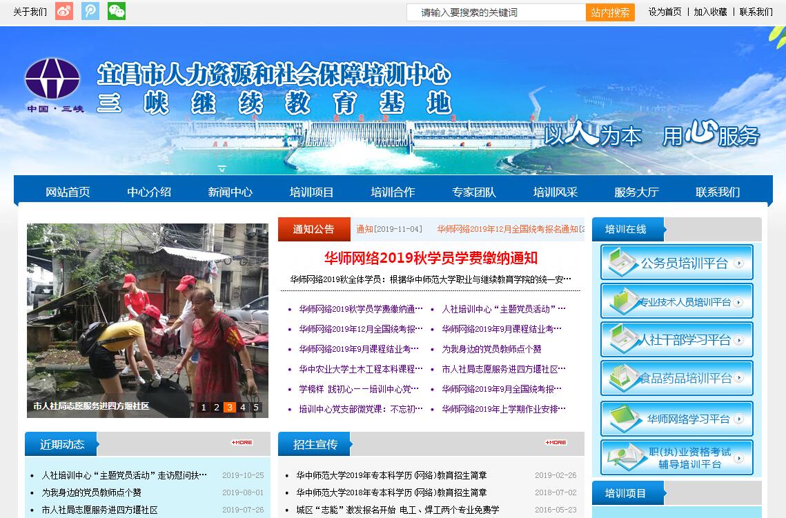 宜昌市人力资源和社会保障培训中心是经市政府批准,由市干部培训中心、军队转业干部培训中心、劳动培训教育中心整合成立的公益二类事业单位,隶属于市人力资源和社会保障局。是湖北省公务员、军队转业干部培训基地和三峡继续教育基地,湖北省职能技能培训鉴定定点机构,是湖北省总工会职业技能(创业)培训机构,宜昌市就业创业培训、退役士兵技能培训定点机构,宜昌市特种作业人员安全技术培训考核基地。是湖北省最大的人力资源和社会保障培训机构,宜昌市最具特色的短期职业技能培训基地。其主要职责是:中心负责市直行政机关公务员培训和全市新录用公务员初任培训;企事业单位专业技术人员继续教育公需科目培训和市直事业单位新录用工作人员初任培训;军队转业干部岗前培训;劳动就业创业培训;全市职称(执业)资格及计算机、外语考前培训;专本科及研究生学历教育培训;城镇失业人员、进城务工人员、未就业大学毕业生、初(高)中毕业生、退役士兵等技能培训;各类用人单位在职人员技能提升培训和鉴定。中心现拥有2个门户网站;一个国家级云技术在线学习平台,载有1000多套权威专家优质课件,可供100000人同时在线学习;教学场地近10000平方米,配有全空调教室30余间、多功能报告厅2个、计算机教室3个;建有电工、电焊工、厨师、美容针灸按摩、家政养老护理及酒店管理与服务等多个实用技能培训实训基地;配备各类教学设施、设备500余台(套),年培训能力可达60000人以上;具有一支包括国家级专家、大学教授、高级讲师、高级工程师等在内的高素质专兼职师资队伍,积累了丰富的培训教学和学历教育经验。中心培训项目齐全,功能完备,形式多样,能够满足各类人才的多元化培训需求。中心于1984年成立以来,先后开展了公务员、企事业单位专技人员、军转干部、厂长(经理)、车间主任等管理型人才的培训;开设了成人学历教育培训班;开办了专业技术人员、技能人才职称和职业资格考前辅导班;开展了城乡失业人员、大学毕业生就业创业培训、退役士兵及技术工种职业技能培训和电工、焊工、登高作业等特种作业人员安全技术培训工作,各类培训项目(专业)达40余个,为社会培养了大批专本科和研究生及高技能人才,具有良好的培训品牌和信誉。现每年有60000多人在中心参加各类专业知识学习、专本科学历教育和就业创业培训。我们坚持“以人为本,用心服务”的培训理念,发扬“团结、务实、严谨、高效”的团队精神,秉承“培养人才,服务人才”的办学思路,坚持以市场需求为导向,以培养高素质人才为目标,努力为你完备知识结构、提升素质修养、成就创业梦想、创造美好未来提供优质培训服务,为宜昌经济社会发展提供人才和智力支持。